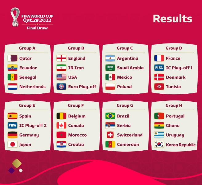 কাতারের দোহায় অনুষ্ঠিত হয়ে গেল কাতার বিশ্বকাপের ড্র। ৩২ দলকে আটটি গ্রুপে ভাগ করা হয়েছে। সবচেয়ে কঠিন গ্রুপে পড়েছে চার বারের চ্যাম্পিয়ন জার্মানি। তাদের প্রতিপক্ষ একবারের চ্যাম্পিয়ন স্পেন। এছাড়া লিওনেল মেসির আর্জেন্টিনার প্রতিপক্ষ রবার্তো লেভানদোস্কির পোল্যান্ড। বর্তমান চ্যাম্পিয়ন ফ্রান্স গ্রুপ ডি’তে। গ্রুপ ‘জি’তে পড়েছে পাঁচ বারের বিশ্ব চ্যাম্পিয়ন ব্রাজিল। গ্রুপ পর্বে তাদের প্রতিপক্ষ ইউরোপের দুই দল সার্বিয়া ও সুইজারল্যান্ড এবং আফ্রিকান দল ক্যামেরুন। কাতার বিশ্বকাপে একই গ্রুপে পড়েছে ক্রিস্তিয়ানো রোনালদোর পর্তুগাল ও এডিসন কাভানির উরুগুয়ে। দুইবারের বিশ্বচ্যাম্পিয়ন উরুগুয়ের গত বিশ্বকাপের শেষ ষোলোতে পর্তুগালকে হারিয়ে কোয়ার্টার ফাইনালে পা দিয়েছিল। একবারের চ্যাম্পিয়ন ইংল্যান্ড পড়েছে গ্রুপ ‘বি’তে। স্বাগতিক কাতারের গ্রুপে আছে তিনবারের ফাইনালিস্ট নেদারল্যান্ডস। গত আসরের রানার্সাপ ক্রোয়েশিয়া পড়েছে গ্রুপ এফ’এ। তাদের প্রতিপক্ষ ফিফা র্যাংকিংয়ের দুই নাম্বার দল বেলজিয়াম।