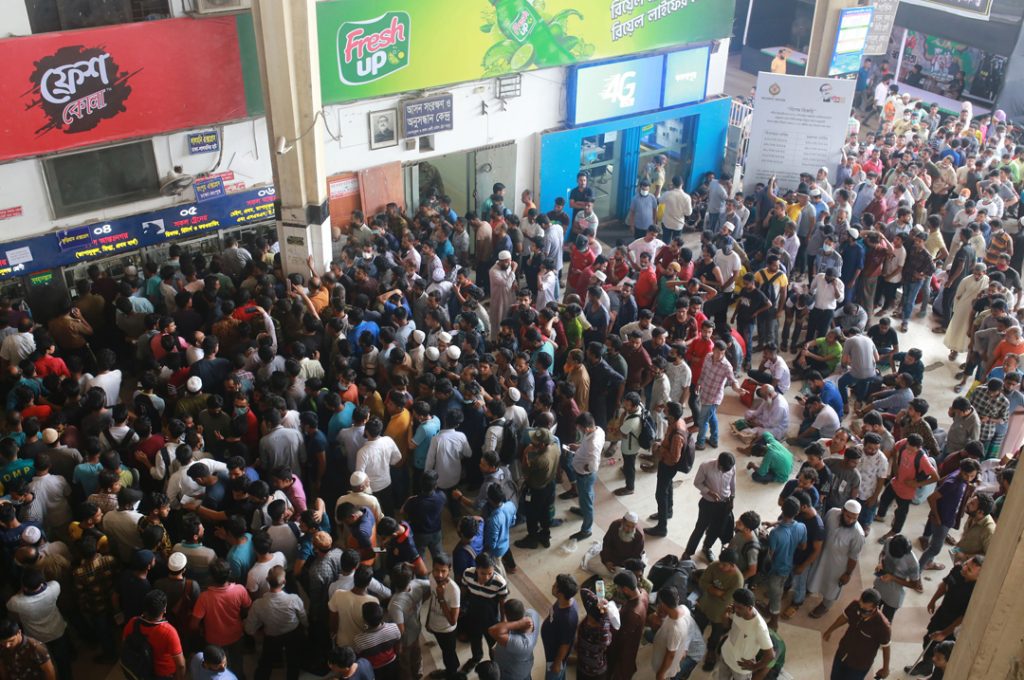 টিকিট পাবো কি না বুঝতে পারছি না। রাত ১০টায় নারায়ণগঞ্জের কাঁচপুর থেকে কমলাপুর এসে লাইনে দাঁড়িয়েছেন মো. সুহেল রানা। তিনি বলেন, দিনাজপুর যাওয়ার টিকিট কাটতে আসলাম। রাতে এসে দাঁড়িয়েছি। সেহেরিও স্টেশনেই করতে হয়েছে। প্রতিবার ঈদ আসলেই এমন ভোগান্তিতে পড়তে হয়। রংপুরে যাওয়ার জন্য গত রোববার (২৪ এপ্রিল) টিকিট কাটতে আসেন সাবিনা ইয়াসমিন। তিনি বলেন, গতকালও (গত রোববার) এসেছিলাম, টিকিট পাইনি। আজ (সোমবার) রাত ৩টার পর এসে লাইনে দাঁড়িয়েছি। এখনো অনেকেই টিকিট পাননি। কাউন্টার থেকে দেরি করে টিকিট দিচ্ছে। আসন্ন পবিত্র ঈদুল ফিতর উপলক্ষে গত শনিবার (২৩ এপ্রিল) থেকে ট্রেনের অগ্রিম টিকিট বিক্রি শুরু হয়েছে। গত রোববার দেওয়া হয় ২৮ এপ্রিলের টিকিট। সোমবার (২৫ এপ্রিল) ২৯ এপ্রিলের টিকিট। মঙ্গলবার দেওয়া হবে ৩০ এপ্রিলের টিকিট। আর ২৭ এপ্রিল দেওয়া হবে ১ মে’র টিকিট। এছাড়া ৩ মে ঈদ হলে ২৮ এপ্রিল বিক্রি হবে ২ মে’র ট্রেনের টিকিট। ঈদ যাত্রা শেষে ট্রেনের ফিরতি টিকিট বিক্রি শুরু হবে ১ মে থেকে। এবারের ঈদযাত্রার সুবিধার্থে ছয় জোড়া বিশেষ ট্রেন চালানোর সিদ্ধান্ত নিয়েছে রেল কর্তৃপক্ষ। সোমবার (২৫ এপ্রিল) থেকে বিশেষ ট্রেনের টিকিট বিক্রিও শুরু হয়।