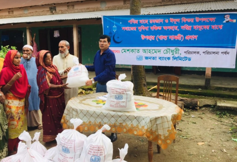 সুনামগঞ্জ জেলার জামালগঞ্জ উপজেলার মানিগাঁও গ্রামে জনতা ব্যাংকের পক্ষ থেকে পবিত্র মাহে রমজান ও ঈদুল ফিতর উপলক্ষ্যে সমাজের সুবিধা বঞ্চিত অসহায় ও দরিদ্র মানুষের মাঝে উপহার(খাদ্য সামগ্রী)বিতরণ করা হয়েছে। অনুষ্ঠানে প্রধান অতিথি হিসাবে ভার্চুয়ালী সংযুক্ত হয়ে এর উদ্বোধন করেন গণপ্রজাতন্ত্রী বাংলাদেশ সরকারের সাবেক যুগ্মসচিব এবং জনতা ব্যাংক লিমিটেড, পরিচালনা পর্ষদের পরিচালক মেশকাত আহমেদ চৌধুরী, একটি প্রেস বিজ্ঞপ্তির মাধ্যমে জানা যায়।