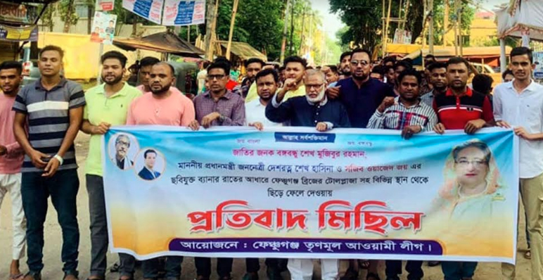 বঙ্গবন্ধু ও প্রধানমন্ত্রীর ছবিযুক্ত ব্যানার ছিঁড়ে ফেলার প্রতিবাদে ফেঞ্চুগঞ্জে তৃণমুল আওয়ামীলীগ ৭দিনের আল্টিমেটাম ঘোষণা করেছে। আগামী ৭দিনের ভিতরে অজ্ঞাতনামা দুষ্কৃতিকারীদের গ্রেফতারসহ দৃষ্টান্তমূলক শাস্তির দাবী জানিয়েছেন তৃণমূল আওয়ামীলীগের নেতাকর্মীরা। এরই অংশ হিসেবে ৭ মে শনিবার বিকেলে ফেঞ্চুগঞ্জ বাজারে এক প্রতিবাদ মিছিল বের হয়।