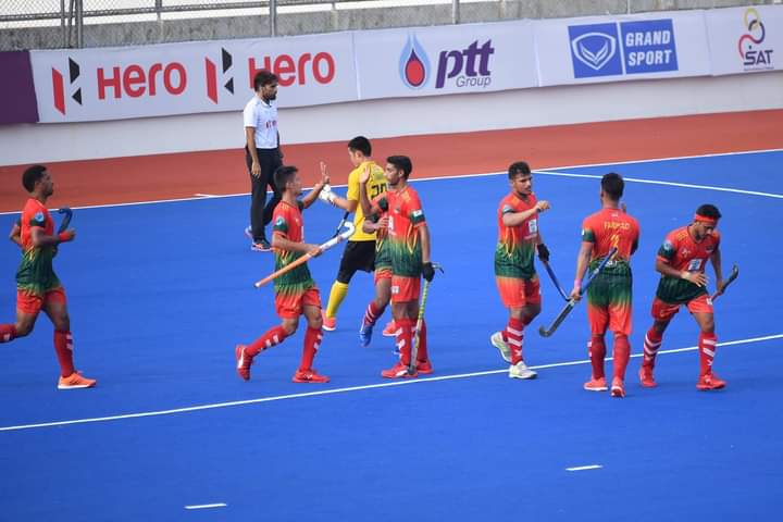 প্রথম কোয়ার্টারেই তিন গোল হজমে পিছিয়ে পড়ে বাংলাদেশ। এরপর ঘুরে দাঁড়ানোর চেষ্টা করেও গোলের মুখ খুলতে পারেনি গোবিনাথান কৃষ্ণমূর্তির দল। তৃতীয় কোয়ার্টারেই চার গোলে পিছিয়ে পড়ায় ম্যাচ থেকেই ছিটকে যায় আশরাফুলরা। বড় হারে চ্যাম্পিয়ন হওয়া হলনা বাংলাদেশের। রোববার (১৫ মে) থাইল্যান্ডের ব্যাংককে এশিয়ান গেমসের বাছাইয়ের ফাইনালে ওমানের কাছে ৬-২ গোলে হেরেছে বাংলাদেশ। এর আগে এএইচএফ কাপে এই ওমানকে টাইব্রেকারে হারিয়ে চ্যাম্পিয়ন হয়েছিল বাংলাদেশ। কিন্তু এবার আর পেরে উঠলোনা গোবিনাথানের দল। প্রথম কোয়ার্টারের দশ মিনিটের মধ্যেই তিন গোল হজম করে বাংলাদেশ। চার মিনিটে পেনাল্টি কর্নারে ওমানকে এগিয়ে নেন আম্মার শাইবি। এরপর আট মিনিটে ফিল্ড গোলে ব্যবধান বাড়ান ফাহাদ লাওয়াতি। দুই মিনিট পরে তৃতীয় গোলটি করেন সালাহ আল সাদি। দ্বিতীয় কোয়ার্টারে কোনো দলই গোল করতে পারেনি। তৃতীয় কোয়ার্টারে আল কাশিমের গোলে ব্যবধানে ৪-০ করে ফেলে ওমান। ফলে ম্যাচে ফেরা কঠিন হয়ে যায় সারোয়ারদের। চতুর্থ কোয়ার্টারের শুরুতেই পেনাল্টি কর্নারে আশরাফুল ইসলামের গোল ব্যবধান কমালেও ৫১ মিনিটে আল ফাজারি এবং ৫৯ মিনিটে আসামা আল শিবলির গোল ওমানের শিরোপা জয় নিশ্চিত করে। শেষ মিনিটে বাংলাদেশের হয়ে ব্যবধান কমান ফজলে রাব্বি।