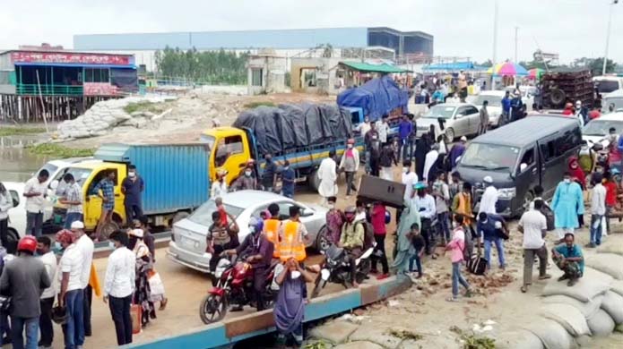 বিধিনিষেধ উপেক্ষা করে শিমুলিয়া ঘাটে মানুষের ভিড় : ফেরিতে সব ধরনের যাত্রীবাহী গাড়ি ও যাত্রী পরিবহন বন্ধ