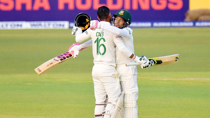 ২৪ রানে নেই বাংলাদেশের ৫ উইকেট। সেখান থেকে দলের হাল ধরেন মুশফিকুর রহিম ও লিটন দাস। দেখেশুনে খেলতে থাকেন অভিজ্ঞ দুই ব্যাটার। বিপর্যয় সামলিয়ে মিরপুরে বীরত্ব রচনা করেন তারা। দুজনই পেয়েছেন শতকের দেখা। গড়েছেন ২৫৩ রানের জুটি। প্রথম দিন শেষে বাংলাদেশের সংগ্রহ ৫ উইকেটে ২৭৭ রান। মুশফিক ১১৫ ও লিটন ১৩৫ রানে অপরাজিত আছেন। অন্য ব্যাটারদের মধ্যে মাহমুদুল হাসান জয়, সাকিব আল হাসান ও তামিম ইকবাল শূন্য রানে আউট হয়েছেন। নাজমুল হোসাইন শান্ত ৮ ও অধিনায়ক মুমিনুল হক ৯ রান করেছেন। এদিকে চট্টগ্রামে সিরিজের প্রথম টেস্টে তুলে নেন টেস্ট ক্যারিয়ারে নিজের অষ্টম শতক। সোমবার (২৩ মে) দ্বিতীয় টেস্টের প্রথম দিন তুলে নিলেন নবম শতক। টানা দুই ইনিংসে দুটি সেঞ্চুরি করে মুশফিক জানান দিলেন তিনি ফুরিয়ে যাননি। শতক পূর্ণ করতে ২১৮ বল মোকাবিলা করেছেন মুশফিকুর রহিম। উইলোতে ১১টি চারের মার। কোনো ছক্কা মারেননি। অন্য ব্যাটার লিটন দাস তুলে নিয়েছেন টেস্ট ক্যারিয়ারে তৃতীয় শতক। ১৪৯ বল মোকাবিলায় তিন অঙ্কের ম্যাজিক ফিগার স্পর্শ করেন এই উইকেটকিপার ব্যাটার। উইলোতে রয়েছে ১৩টি চারের মার। কোনো ছয়ের মার নেই। গতকাল সোমবার সকালে দিনের প্রথম সেশনের শুরুর ৪৫ মিনিটেই ৫ উইকেট হারিয়ে বসে টাইগাররা। তখন দলের স্কোর ছিল ২৪ রান। সেখান থেকে অনবদ্য এক গল্প লিখা শুরু করেন মুশফিকুর রহিম ও লিটন দাস। দুই ডানহাতি ব্যাটসম্যান শুরুতে উইকেটে থিতু হতে সময় নিয়েছিলেন। এরপর প্রতি আক্রমণে জোড়া সেঞ্চুরিতে জবাব দেন তারা।