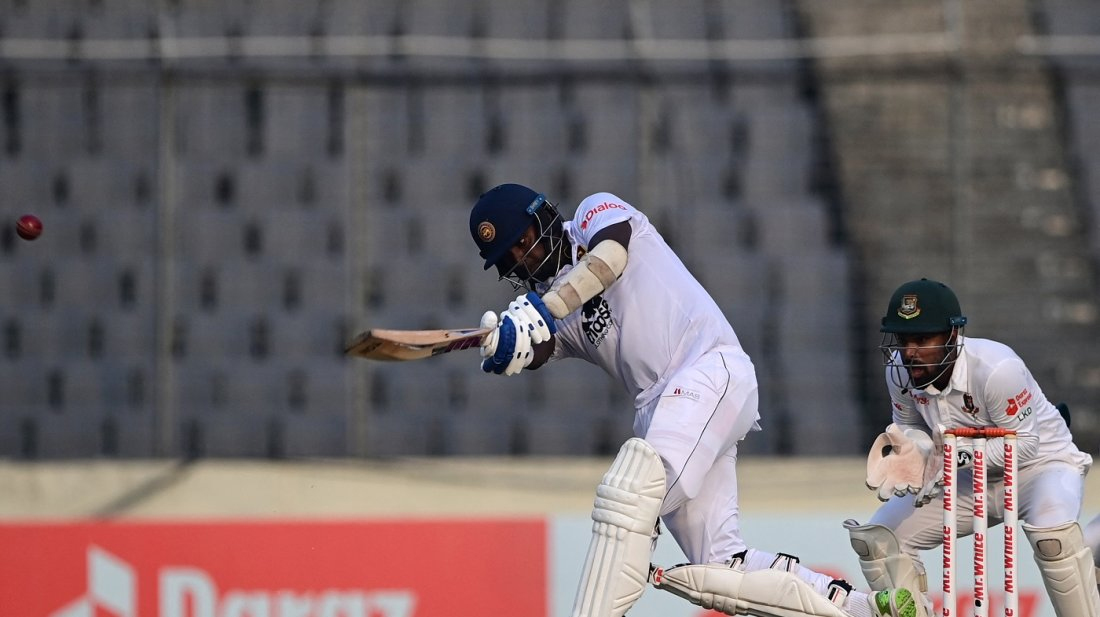 দ্বিতীয় টেস্টে তৃতীয় দিনের প্রথম ঘণ্টাটা ছিল বাংলাদেশের। দুটি উইকেট তুলে নিয়ে সফরকারীদের চাপে ফেলা গিয়েছিল। কিন্তু চতুর্থ উইকেট পড়ার পর লড়াই চললো অ্যাঞ্জেলো ম্যাথুজ-ধনাঞ্জয়া ডি সিলভার। শেষ দিকে ১০২ রানের এই জুটি ভাঙলেও বাংলাদেশের সঙ্গে প্রথম ইনিংসের ব্যবধানটাকে কমিয়ে আনতে অবদান রেখেছেন এই দুজন। তাতে লঙ্কানদের লড়াইয়ে শেষ হলো তৃতীয় দিন। ৯৭ ওভার শেষে প্রথম ইনিংসে সফরকারীদের সংগ্রহ ৫ উইকেটে ২৮২ রান। শ্রীলঙ্কা পিছিয়ে আর ৮৩ রানে। ২ উইকেটে ১৪৩ রান নিয়ে শ্রীলঙ্কা তৃতীয় দিন শুরু করেছিল। পিছিয়ে থেকে ব্যাট করতে নামলে দিমুথ করুনারতেœ এবাদতের প্রথম বলে সিঙ্গেল নেন। পরের বলেই রাজিথার অফস্টাম্প উপড়ে দ্বিতীয় উইকেটের দেখা পান এবাদত। ১২ বল খেলা রাজিথা কোনও রান না করেই সাজঘরে ফিরেছেন। তার পর ম্যাথুজ-করুনারতেœ মিলে পরিস্থিতি সামাল দেওয়ার চেষ্টা করেন কিছুক্ষণ। এ সময় পেসাররা বেশ কয়েক বার পরাস্ত করেন তাদের। কিন্তু কাক্সিক্ষত সাফল্য মিলছিল না। ৭০ রান নিয়ে তৃতীয় দিন শুরু করা করুনারতেœ শতরানের কাছেও পৌঁছে যাচ্ছিলেন। ৮০ রান করা ব্যাটারকে বেশি দূর যেতে দেননি সাকিব আল হাসান। ৫৬তম ওভারের শেষ বলে করুনারতেœকে দারুণ ডেলিভারিতে বোল্ড করেছেন। সাকিবের ঘূর্ণি বুঝতেই পারেননি তিনি। ড্রাইভ করতে গেলে বল ব্যাট-প্যাডের ফাঁক গলে আঘাত করে স্টাম্পে। ১৫৫ বল খেলা করুনারতেœ শেষ পর্যন্ত ফেরেন ৮০ রানে। জীবন পাওয়া এই ইনিংসটিতে ছিল ৯টি চারের মার। লাঞ্চ বিরতির আগে প্রথম সেশনে মোট ২৪.১ ওভার খেলা হয়েছে। দুটি উইকেটের বিনিময়ে লঙ্কানরা যোগ করেছে ৬৭ রান। করুনারতেœর প্রতিরোধ ভাঙায় কিছুটা চাপে পড়ে যায় শ্রীলঙ্কা। সেখান থেকে দলকে উদ্ধার করেছে মূলত ম্যাথুজ-ধনাঞ্জয়া জুটি। প্রথম সেশন থেকে অ্যাঞ্জেলো ম্যাথুজ প্রান্ত আগলে খেলেছেন। ধনাঞ্জয়া ডি সিলভাকে সঙ্গী করে জুটি গড়েন পঞ্চম উইকেটে। বৃষ্টিতে দ্বিতীয় সেশন ভেসে যাওয়ার পর তৃতীয় সেশনেও দাপট দেখাতে থাকেন তারা। মেরামত করেন ইনিংস। অবশ্য বৃষ্টি বিরতির পর তৃতীয় সেশন শুরু-ই হয়েছে বিলম্বে। খেলা বিকাল ৪টায় শুরু হলেও দুজনের ফিফটি তুলে নেওয়ার পথে বাধা হতে পারেনি বাংলাদেশ। তবে দিনের শেষভাগে এসে পঞ্চম উইকেট জুটিটি ভেঙেছেন সাকিব আল হাসান। ধনাঞ্জয়া ডি সিলভা দশম ফিফটি তোলার পথে রান যোগ করছিলেন দ্রুত। ৮৭.৫ ওভারে এসে এই ধনাঞ্জয়া গ্লাভসবন্দি হয়েছেন ৫৮ রানে। অবশ্য শুরুতে সাকিব এই আউট নিয়ে নিশ্চিত ছিলেন না। পরে লিটনের সমর্থনে রিভিউ নিলে দেখা যায় বল ব্যাটে লেগে গ্লাভসে জমা পড়েছে। ৯৫ বলের ইনিংসে ধনাঞ্জয়া মারেন ৯টি চার। সকাল থেকে খেলা ম্যাথুজ অবশ্য প্রান্ত আগলে আছেন এখনও। ৩৮তম ফিফটি তুলে ৫৮ রানে ব্যাট করছেন।