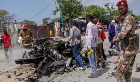 পূর্ব আফ্রিকার দেশ সোমালিয়ায় আত্মঘাতী গাড়ি বোমা হামলায় ৯ জন নিহত হয়েছেন। এ ঘটনায় আহত হয়েছেন আরো অন্তত আট জন। শনিবার দেশটির রাজধানী মোগাদিশুতে পুলিশ কমিশনার ফারহান মোহাম্মদকে লক্ষ করে এই হামলা চালানো হয় বলে স্থানীয় কর্মকর্তাদের বরাত দিয়ে ব্রিটিশ সংবাদমাধ্যম দ্য গার্ডিয়ান জানিয়েছে। প্রতিবেদনে বলা হয়, রাজধানীর একটি সড়কের ব্যস্ত সংযোগস্থলে এই ঘটনা ঘটে। পুলিশ কমিশনারের গাড়ি বহর লক্ষ্য করে এই হামলা চালানো হয়। এ সময় তিনি গাড়ির ভিতরেই ছিলেন। তবে সৌভাগ্যক্রমে বেঁচে ফিরেছেন তিনি। এদিকে প্রাণঘাতী এই হামলার দায় স্বীকার করেছে স্থানীয় জঙ্গিগোষ্ঠী আল-শাবাব। ৯ জনের মৃত্যুর বিষয়টি নিশ্চিত করে মোগাদিশু মদিনা হাসপাতালের ডা. মোহাম্মদ নূর জানান, তার হাসপাতালে নেয়া রোগী ও মৃতদেহ হিসেব করে এই সংখ্যাটি জানানো হয়েছে। তিনি আরও বলেন, আমি নিশ্চিত, এই সংখ্যাটি আরো বাড়তে পারে। কারণ ভুক্তভোগীদের অন্যান্য হাসপাতালেও নেয়া হয়েছে।