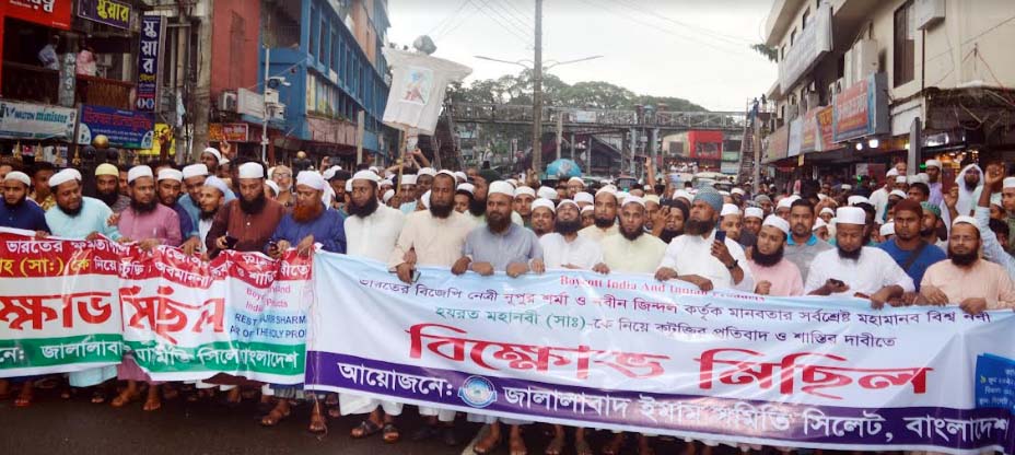 মহানবী হযরত মুহাম্মদ (সা.) সম্পর্কে ভারতের ক্ষমতাশীন দল বিজেপি’র জ্যেষ্ঠ দুই নেতা নুপুর শর্মা ও নবীন জিন্দলের কুটুক্তির প্রতিবাদে সিলেট মহানগরীতে বিক্ষোভ মিছিল ও সমাবেশ করেছে জালালাবাদ ইমাম সমিতি।