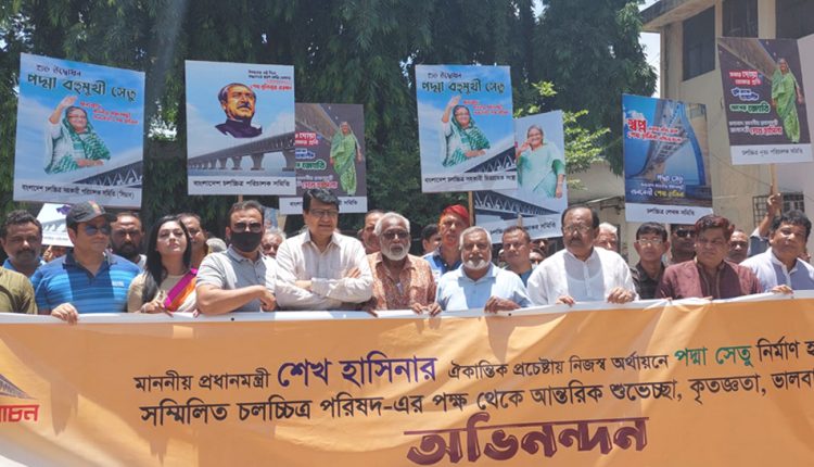 স্বপ্নের পদ্মা সেতু উদ্বোধনের ফলে আনন্দের জোয়ার বইছে দেশের মানুষের মনে। যা ছুঁয়ে গেছে চিত্রতারকাদের মনেও। ফলে তারাও উচ্ছ্বাস প্রকাশ করে সামিল হয়েছেন আনন্দ মিছিলে! রাজপথে নেমে স্লোগান দিয়ে প্রধানমন্ত্রী শেখ হাসিনাকে উষ্ণ অভিনন্দন জানিয়েছেন চিত্রতারকা থেখে শুরু করে এফডিসির নির্মাতা ও অন্যান্য কলাকুশলীরা। সোমবার (২৭ জুন) দুপুর সাড়ে ১২টার দিকে এফডিসিতে আনন্দ মিছিল করতে দেখা যায় চিত্রনায়ক রিয়াজ, ফেরদৌস, নিপুণদের। এ সময় তাদের সঙ্গে উপস্থিত ছিলেন নায়ক আলমগীর, চিত্রপরিচালক কাজী হায়াত, সোহানুর রহমান সোহানসহ অনেকে। এফডিসির প্রশাসনিক ভবন থেকে মূল ফটক ঘুরে কারওয়ান বাজার রেল ক্রসিং ঘুরে আবারও এই আনন্দ মিছিলটি এফডিসিতে এসে শেষ হয়। মিছিল শেষে পরিচালক সমিতির সভাপতি সোহান জানান, সম্মিলিত চলচ্চিত্র পরিষদের উদ্যোগে প্রধানমন্ত্রীকে অভিননন্দ জানাতে এই উদ্যোগ। এফডিসির সবগুলোর সংগঠনের পক্ষে কেউ না কেউ উপস্থিত ছিলেন। ২৫ জুন পদ্মা সেতু উদ্বোধন হয়। দেশের দক্ষিণ পশ্চিমাঞ্চলের সঙ্গে রাজধানীর যোগাযোগ ব্যবস্থার নতুন দ্বার উন্মোচিত হয়। বিশেষ করে অর্থনৈতিক ক্ষেত্রে নতুন বিপ্লব হতে পারে বলে সবাই ধারণা করছেন। এই সাধ্য সাধনের ফলে প্রধানমন্ত্রীকে ধন্যবাদ জানিয়ে চলচ্চিত্র পরিষদের প্রধান নায়ক আলমগীর বলেন, বিশ্ব ব্যাংক যখন দেশিয় একটি ষড়যন্ত্রের কারণে মুখ ফিরিয়ে নেয় তখন প্রধানমন্ত্রী নিজের অর্থায়নে পদ্মা সেতু করে দেখিয়ে দিয়েছেন। এজন্য প্রধানমন্ত্রী অনেক অনেক ধন্যবাদ। আলমগীর বলেন, প্রধানমন্ত্রী দীর্ঘজীবি হোন। সাহসিকতার সঙ্গে আরও বড় বড় কাজ করুন। আমরা আপনার সাথে আছি। শিল্পী সমিতির কার্যনির্বাহী সদস্য ও চিত্রনায়ক রিয়াজ বলেন, জাতির পিতা বলেছিলেন বাঙালিদের দাবিয়ে রাখা যাবে না। তারই সুযোগ্য কন্যা প্রধানমন্ত্রী আবারও প্রমাণ করলেন আমাদের দাবিয়ে রাখা যায় না। দেশ বিদেশের অসংখ্য ষড়যন্ত্রকে ঠেলে আমাদের পদ্মা সেতু চালু হয়েছে। এতে করে আমাদের দেশের আরও সমৃদ্ধি হবে। ধন্যবাদ জানাই আমাদের প্রধানমন্ত্রীকে। চিত্রনায়ক ফেরদৌস বলেন, প্রধানমন্ত্রী আমাদের শুধু স্বপ্ন দেখান না, স্বপ্ন বাস্তবায়ন করে দেখান। আগামীতে আমরা প্রধানমন্ত্রীর মাধ্যমে আরও বড় স্বপ্ন দেখতে চাই এবং দেশের সকল মানুষ সেই স্বপ্নের বাস্তবায়নে একসঙ্গে কাজ করতে চাই। নিপুণ বলেন, পদ্মা সেতু একটি স্বপ্নের সফল বাস্তবায়ন। এটি সমগ্র মানুষের দেশ বাংলাদেশের একটি বড় অর্জন। প্রধানমন্ত্রীর উদ্যোগ ও বলিষ্ঠ নেতৃত্ব আছে বলেই এই অর্জন সম্ভব হয়েছে। তাই দেশমাতার জন্য অনেক দোয়া ও ভালোবাসা।