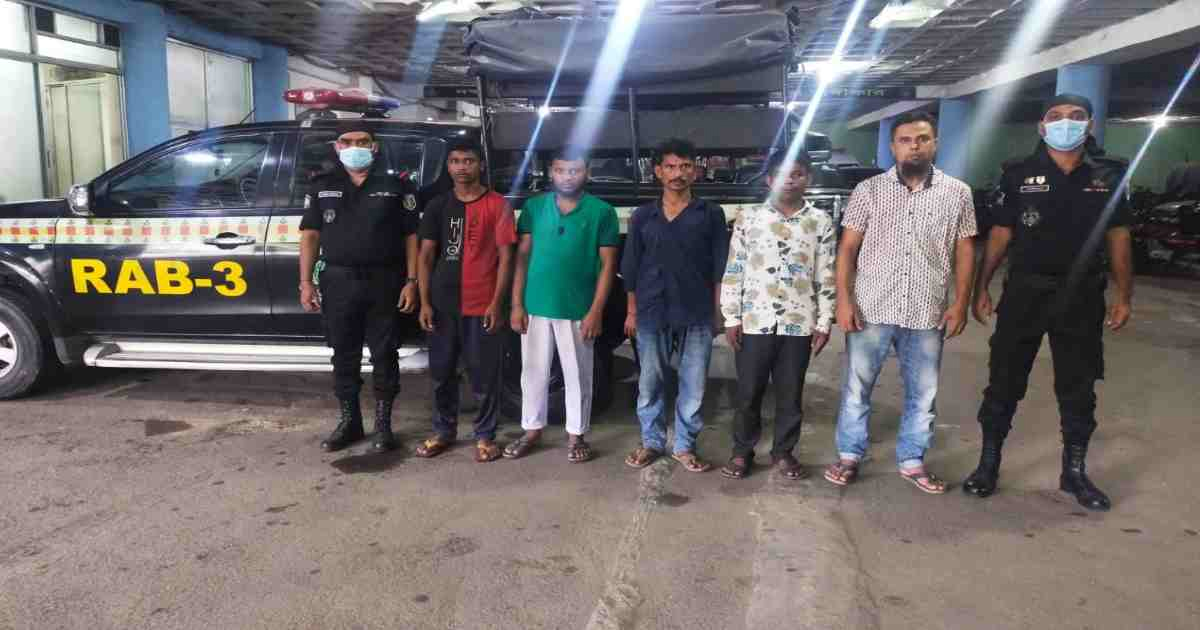 আটকরা হলেন- মো. লিটন মিয়া (৩৭), মো. শাহ আলম (৩৪), মো.ইমরান (২০), মো. আবু তাহের (২৬) ও মো. জাহিদুর রহমান সাকিব (৪০), মঙ্গলবার র্যাব-৩ এর বিজ্ঞপ্তিতে জানানো হয়।