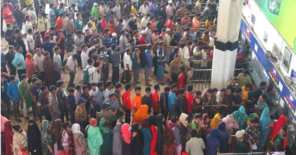 টিকিটের জন্য যাত্রীরা ঘন্টার পর ঘন্টা দীর্ঘ লাইনে অপেক্ষা করার সময় সামাজিক দুরত্বের বালাই থাকছে না। এ সময় প্রত্যেকে উদ্বিগ্ন হয়ে অপেক্ষা করছে, কখন তারা তাদের কাঙ্ক্ষিত টিকিট পাবে!