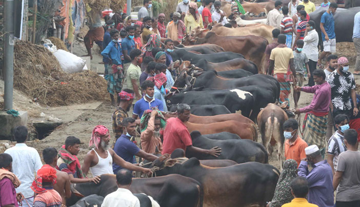 হাটের ধারণ ক্ষমতা অনুযায়ী নির্দিষ্ট সংখ্যক ক্রেতাকে প্রবেশ করতে দিতে হবে। বাকিরা বাইরে নিরাপদ দূরত্ব বজায় রেখে অপেক্ষা করবেন। তাছাড়া একটি পশু কিনতে একসঙ্গে দুজনের বেশি হাটে ঢুকতে পারবে না। হাটে প্রবেশ ও বের হওয়ার গেটের দুই পাশে এবং পশুর হাটের মাঝে পর্যাপ্ত সংখ্যক পানির আধার, বেসিন ও সাবান এবং আলাদা স্থানে হ্যান্ড স্যানিটাইজার রাখতে হবে। হাটে ঢোকার আগে ও বের হয়ে ক্রেতাকে হাত ধুতে হবে। হাটে সব কর্মীকে স্বাস্থ্যবিধির প্রশিক্ষণ দিতে হবে। শিশু ও বৃদ্ধদেরও ঢুকতে দেওয়া যাবে না। এসব শর্তগুলোর মধ্যে মাঝে মধ্যে শুধু ইজারাদার মাইকে সচেতনতা মূলক কিছু বার্তা ঘোষণা করছেন। আর হাটের বিভিন্ন স্থানে স্বাস্থ্যবিধির সচেতনতামূলক কিছু নিয়ম সংবলিত বার্তা ঝুঁলিয়ে রাখা হয়েছে। রোববার (১৮ জুলাই) রাজধানীর শাহজাহানপুর মৈত্রী সংঘের মাঠে গিয়ে দেখা গেছে, হাটের মধ্যে স্বাস্থ্যবিধি বলতে কোনও কিছুই দেখা যাচ্ছে না। অধিকাংশ মানুষকে মাস্ক ছাড়াই হাটে দলবেঁধে প্রবেশ করতে দেখা গেছে। কিছু স্বেচ্ছাসেবক নিয়োগ করা হলেও তারা পশুর হাসিল আদায়ে ব্যস্ত। স্বাস্থ্যবিধি সম্পর্কে তাদেরও কোনও সচেতনতা নেই। অধিকাংশ স্বেচ্ছাসেবককে মুখের নিচে মাস্ক ঝুলিয়ে রাখতে দেখা গেছে। একই চিত্র আফতাব নগর হাটের। হাটে বিপুল সংখ্যক কোরবানির পশু দেখা গেলেও বেচা-বিক্রি এখনো শুরু হয়নি। তবে হাটে শিশু-বৃদ্ধ থেকে শুরু করে সব বয়সের মানুষ দেখা গেছে। হাটের প্রবেশপথগুলোতে হাত ধোয়ার কোনও ব্যবস্থা দেখা যায়নি। ভেতরেও নেই কোনও স্বাস্থ্য বিধি তবে হাটটি পরিদর্শনে এসে ঢাকা উত্তর সিটি করপোরেশনের মেয়র মো. আতিকুল ইসলাম কঠোর বার্তা দিয়েছেন। তিনি বলেছেন, স্বাস্থ্যবিধি না মানলে প্রয়োজনে হাট বাতিল করা হবে। মেরাদিয়া হাটে গিয়ে দেখা গেছে, এলাকার প্রধান সড়কটিতে গরুর হাট বসিয়ে দেওয়া হয়েছে। হাটের স্বেচ্ছাসেবকরা ট্রাক থেকে গরু নামানোর কাজে ব্যস্ত। স্বাস্থ্যবিধি সম্পর্কে নেই কোনও সচেতনতা। হাটটিতে সিটি করপোরেশনের ঘোষণা অনুযায়ী কোনও ভ্রাম্যমাণ আদালতও দেখা যায়নি। বনশ্রীর বাসিন্দা হাজী আশরাফুল ইসলাম বলেন, যে পরিমাণ মানুষ তাতে খুবই আতঙ্ক লাগবে। করোনাকালেও কোনও স্বাস্থ্যবিধি নেই। যে যার মতো করে ঘুরে বেড়াচ্ছে। বিনা কারণেও হাটে বিপুল পরিমাণ মানুষের সমাগম ঘটছে। কেউ বাধাও দিচ্ছে না। আমি একজন স্বাস্থ্য সচেতন মানুষ। হাটে ঢুকতে এখন আমার আতঙ্ক লাগছে। খিলগাঁও এলাকার বাসিন্দা নাজমুল হাসান বলেন, কীসের স্বাস্থ্যবিধি আর নিয়ম-কানুন। হাট বসানোর আগে সিটি করপোরেশন অনেক কথা বলে। কিন্তু কোনও জরিমানা বা কোনও সতর্কতা কিছুই করা হয় না। অনেক শর্তের কথা শুনেছি। কিন্তু সব তো দেখি কাগজে আর করলে। হাটে নেই। বি