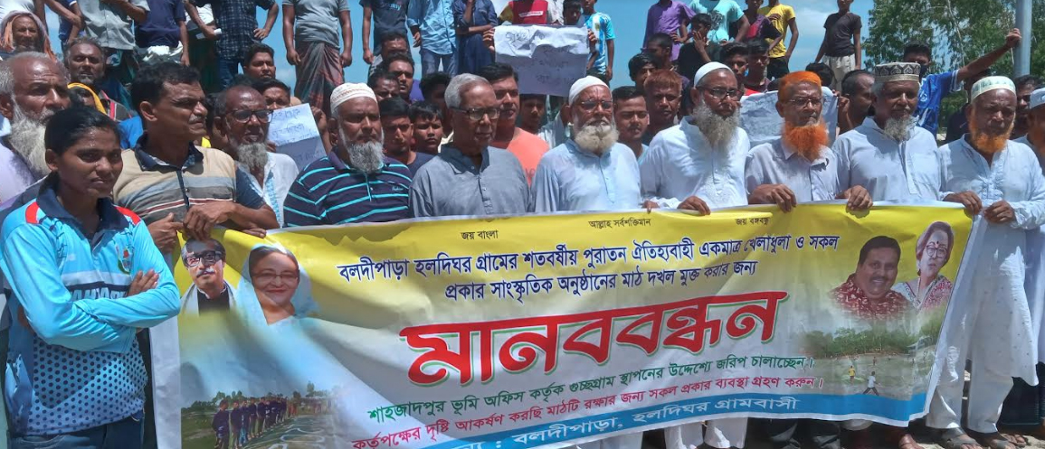 শাহজাদপুরে শতবর্ষী ঐতিহ্যবাহী খেলার মাঠ রক্ষায় এক কাতারে হাজার গ্রামবাসী