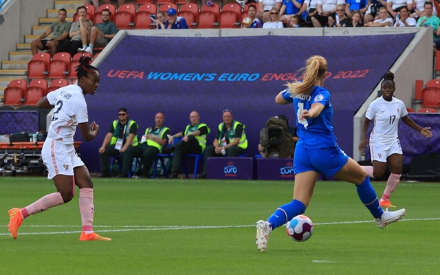 উইমেন’স ইউরোর চলতি আসরে দ্রুততম গোলের রেকর্ড গড়ল ফ্রান্স। আইসল্যান্ডের বিপক্ষে ম্যাচ শুরুর ৪৩ সেকেন্ডের মাথায় গোলটি করেন ফরোয়ার্ড মেলভাইন মালার্ড। সোমবার ‘ডি’ গ্রুপের ম্যাচটি ১-১ ড্র হয়েছে। এতে কোনো ম্যাচ না হেরেও আসর থেকে বিদায় নিতে হয়েছে আইসল্যান্ডকে। টুর্নামেন্টের ইতিহাসে তারাই প্রথম দল, যারা অপরাজিত থেকে ছিটকে গেছে গ্রুপ পর্ব থেকে। আইসল্যান্ড এর আগে বেলজিয়াম ও ইতালির বিপক্ষেও ১-১ ড্র করে। শেষ রাউন্ডের আগে দলটির কোয়ার্টার-ফাইনালে খেলার স্বপ্ন বেঁচে ছিল। কিন্তু অন্য ম্যাচে ইতালির বিপক্ষে ১-০ গোলের জয়ে ‘ডি’ গ্রুপের দ্বিতীয় স্থান নিশ্চিত করে বেলজিয়াম। ফ্রান্সের আগে থেকেই সেরা আটে খেলা নিশ্চিত ছিল। এমনকি গ্রুপ চ্যাম্পিয়নও। তাতে অনেকটা নির্ভার হয়ে মাঠে নামা দলটি মালার্ডের রেকর্ড গোলে এগিয়ে যায়। বাকি সময়ে আইসল্যান্ড খেলায় ফেরার সর্বোচ্চ চেষ্টা করে। দ্বিতীয়ার্ধে নিজেদের উজাড় করে দেওয়া দলটি নির্ধারিত সময়ে গোলের দুটি দারুণ সুযোগও পায়; কিন্তু সাফল্য আসেনি। অবশেষে যোগ করা সময়ের দ্বাদশ মিনিটে বেইনিয়াসদোতিরে সফল স্পট কিকে সমতা টানতে পারে দলটি। তবে তাতে শেষ আটে ওঠার সমীকরণ মেলানো হয়নি তাদের। ইতালিকে ৫-১ গোলে উড়িয়ে টুর্নামেন্ট শুরু করে ফ্রান্স। এরপর বেলজিয়ামকে ২-১ গোলে হারিয়ে এক ম্যাচ বাকি থাকতেই কোয়ার্টার-ফাইনাল নিশ্চিত করে আসরের ফেভারিটরা। শেষ চারে ওঠার লড়াইয়ে আগামী শনিবার নেদারল্যান্ডসের বিপক্ষে খেলবে ফ্রান্স। আগের দিন বেলজিয়াম খেলবে সুইডেনের বিপক্ষে।