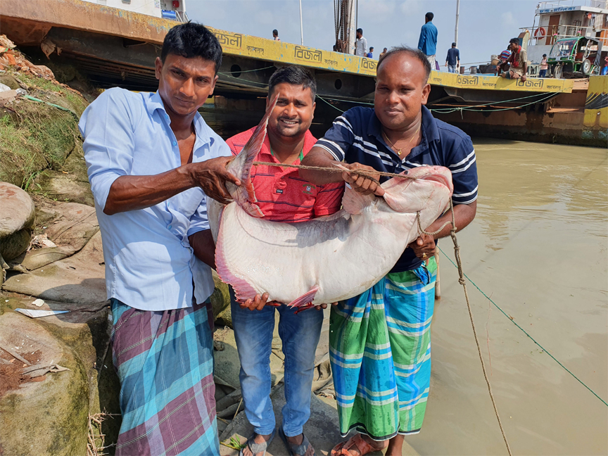 রাজবাড়ীর গোয়ালন্দ উপজেলার দৌলতদিয়ার পদ্মা নদীর মোহনায় জেলেদের জালে একত্রে উঠে এলো প্রায় ৪৭ কেজি ওজনের দুটি বড় পাঙ্গাশ।