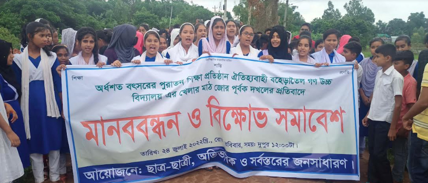 সখীপুরে খেলার মাঠ দখলের প্রতিবাদে শিক্ষার্থীদের বিক্ষোভ