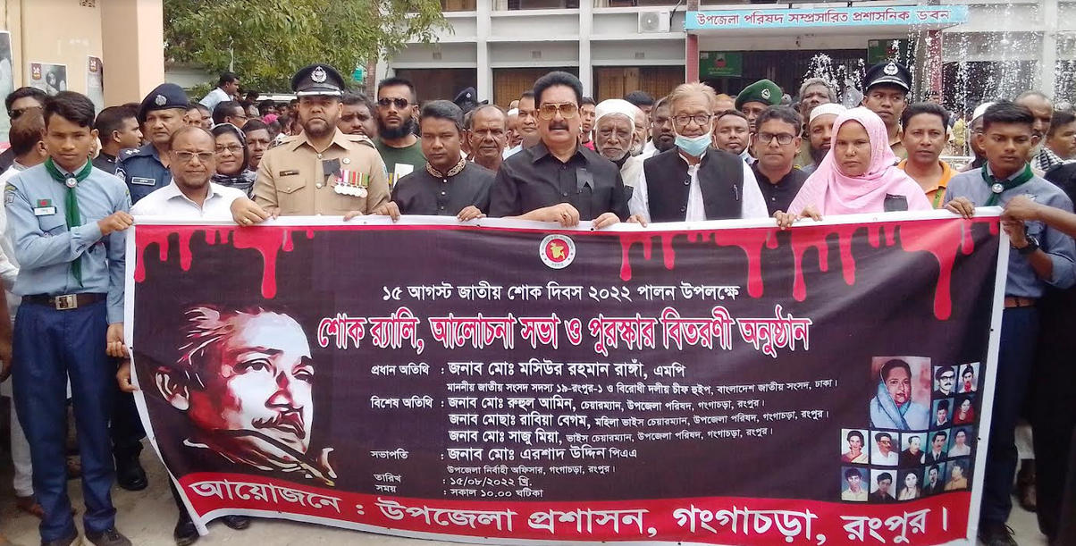 রংপুরের গঙ্গাচড়ায় উপজেলা প্রশাসনের আয়োজনে গতকাল সোমবার নানা কর্মসূচির মধ্যদিয়ে জাতীয় শোক দিবস পালন করা হয়েছে। কর্মসূচিতে প্রধান অতিথি হিসেবে উপস্থিত ছিলেন জাতীয় সংসদের বিরোধী দলীয় চিফ হুইপ আলহাজ্ব মসিউর রহমান রাঙ্গা এমপি। বিশেষ অতিথি হিসেবে উপস্থিত ছিলেন উপজেলা চেয়ারম্যান ও উপজেলা আওয়ামীলীগের সভাপতি আলহাজ্ব রুহুল আমিন, ভাইস চেয়ারম্যান সাজু আহম্মেদ লাল, মহিলা ভাইস চেয়ারম্যান রাবিয়া বেগম। উপজেলা পরিষদ হলরুমে উপজেলা নির্বাহী অফিসার এরশাদ উদ্দিন পিএএ এর সভাপতিত্বে আলোচনা সভায় আরো বক্তব্য রাখেন প্রধান শিক্ষক আব্দুল আখের মিঞা, অধ্যক্ষ মহেন্দ্র চন্দ্র, ইউপি চেয়ারম্যান লিয়াকত আলী, বীর মুক্তিযোদ্ধা আজিজুল ইসলাম, সোলায়মান আলী, নুর ইসলাম, উপজেলা আওয়ামীলীগের সাধারণ সম্পাদক আজিজুল ইসলাম, উপজেলা স্বাস্থ্য ও পরিবার পরিকল্পনা কর্মকর্তা আসিফ ফেরদৌস, ওসি দুলাল হোসেন প্রমূখ। আলোচনা শেষে পুরস্কার বিতরণ করা হয়। এর আগে সকাল ১০ টায় বঙ্গবন্ধুর ম্যুরালে উপজেলা প্রশাসন, মুক্তিযোদ্ধা সংসদ, মডেল থানা, আওয়ামীলীগ, ছাত্রলীগ, যুবলীগ, স্বেচ্ছাসেবক লীগ, শিক্ষা প্রতিষ্ঠান, বিভিন্ন সরকারি-বেসরকারি প্রতিষ্ঠান পুষ্পমাল্য অর্পণ করে শ্রদ্ধা জানায়। পরে ১ মিনিট নিরবতা পালন ও দোয়া করা হয়। সকাল সাড়ে ১০টায় শোক র্যালি গুরুত্বপূর্ণ সড়ক প্রদক্ষিণ করে। এছাড়া সূর্যদয়ের সাথে সকল সরকারি-বেসরকারি, স্বায়ত্তশাসিত প্রতিষ্ঠান, আওয়ামীলীগ, বিভিন্ন সংগঠন, শিক্ষা প্রতিষ্ঠানে জাতীয় পতাকা অর্ধ-নমিত রাখা হয়। শোক দিবস উপলক্ষে হাসপাতাল, এতিমখানায় উন্নত খাবার দেওয়া হয় এবং মুক্তিযোদ্ধা সংসদের উদ্যোগে মুক্তিযোদ্ধা সংসদ ভবনে মিলাদ মাহফিল ও খাবার বিতরণ করা হয়। মসজিদে দোয়া ও মিলাদ মাহফিল ও অন্যান্য ধর্মীয় প্রতিষ্ঠানে বিশেষ প্রার্থনার আয়োজন করা হয়।