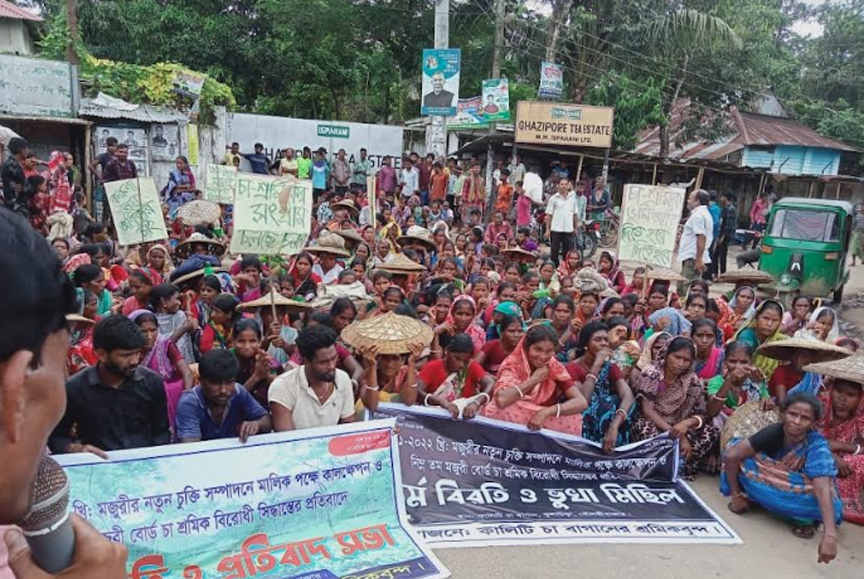 ১২০ টাকা থেকে ৩০০ টাকা মজুরি বৃদ্ধির দাবিতে দেশের চা-বাগানগুলোতে অনির্দিষ্টকালের ধর্মঘট শুরু হয় গত ৭ দিন আগে থেকে। তবে পুরোদমে কর্মবিরতির আজ দ্বিতীয় দিন। এতোদিন ধরে অন্যান্য চা-বাগানে কর্মবিরতিসহ ধর্মঘট কর্মসূচি পালিত হয়ে আসলেও ১৬ আগস্ট মঙ্গলবার মৌলভীবাজারের কুলাউড়া উপজেলার কালিটি চা-বাগানে ভুখা মিছিল করেছেন শ্রমিকরা। এসময় বাগানের ৫৩৭ জন স্থায়ী শ্রমিকসহ প্রায় সহস্রাধিক শ্রমিক একত্রিত হয়ে ভুখা মিছিল নিয়ে কুলাউড়ার গাজীপুর বাজারে এসে রাস্তা অবরোধ করেন। এসময় রাস্তার বিভিন্ন পাশে যানজটের সৃষ্টি হয়। এদিকে, চা-শ্রমিকদের মজুরি বৃদ্ধি নিয়ে চলমান সমস্যা সমাধানে আজ মঙ্গলবার সকাল ১১টা থেকে শ্রীমঙ্গল শ্রম দপ্তর কার্যালয়ে বাংলাদেশ শ্রম অধিদপ্তরের মহাপরিচালক খালেদ মামুন চৌধুরীর সঙ্গে চা-শ্রমিক নেতাদের আলোচনা শুরু হয়েছে।