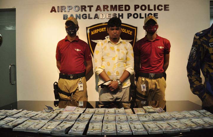 রাজধানীর গুলিস্তানে কাপড়ের ব্যবসা করতেন জাহাঙ্গীর গাজী। গত দুই বছর যাবত তিনি ওই ব্যবসা বাদ দিয়ে অর্থপাচার চক্রের সঙ্গে জড়িয়ে পড়েন। বাংলাদেশ থেকে ইস্তাম্বুল হয়ে মিসরে পাচারের জন্য ১১ লাখ ২০ হাজার রিয়াল নিয়ে দেশ ছাড়ার সময়ে বিমানবন্দরে আটক হয়েছেন তিনি। বাংলাদেশি মুদ্রায় এর মূল্য প্রায় আড়াই কোটি টাকা। এসব মুদ্রা দিয়ে পাচারের জন্য স্বর্ণ কেনা হয় বলে ধারণা বিমানবন্দর আর্মড পুলিশ ব্যাটালিয়ন (এপিবিএন)। সোমবার (২৬ জুলাই) দুপুরে রাজধানীর হযরত শাহজালাল আন্তর্জাতিক বিমানবন্দরের কেনপি-১-এ আয়োজিত এক সংবাদ সম্মেলনে এসব তথ্য জানান বিমানবন্দর আর্মড পুলিশ ব্যাটালিয়নের (এপিবিএন) অতিরিক্ত পুলিশ সুপার মো. জিয়াউল হক। এর আগে সোমবার (২৬ জুলাই) ভোর সাড়ে ৬টার দিকে হযরত শাহজালাল আন্তর্জাতিক বিমানবন্দর থেকে টার্কিশ এয়ারলাইন্সের একটি ফ্লাইটে এসব মুদ্রা পাচারের জন্য নিয়ে যাওয়ার সময় সন্দেহভাজন হিসেবে যাত্রী জাহাঙ্গীর গাজীকে গ্রেপ্তার করে এপিবিএন সদস্যরা। জাহাঙ্গীরের গন্তব্য ছিল তুরস্ক। অত্যন্ত সুকৌশলে লাগেজে ১০টি শার্টের মধ্যে লুকিয়ে ১১ লাখ সৌদি রিয়ালসহ আটটি দেশের মুদ্রা নিয়ে যাচ্ছিলেন তিনি। সংবাদ সম্মেলনে অতিরিক্ত এসপি মো. জিয়াউল হক বলেন, জাহাঙ্গীর গাজী ভোর সাড়ে ৬টার দিকে টার্কিস এয়ারলাইন্সের একটি ফ্লাইটে করে ইস্তাম্বুল যাওয়ার উদ্দেশ্যে বিমানবন্দরে আসেন। সন্দেহভাজন হিসেবে প্রথমে তাকে জিজ্ঞাসাবাদ করা হলে ৫০ হাজার রিয়ালের কথা বলেন। পরে তার লাগেজ তল্লাশি করে ১১ লাখ ২০ হাজার সৌদি রিয়ালসহ আরও ৮টি দেশের মুদ্রা পাওয়া যায়। এর মধ্যে ইউএস ডলার, মালশিয়ান রিঙ্গিত, কুয়েতি দিনারসহ বিভিন্ন মুদ্রা পাওয়া যায়। তিনি বলেন, গ্রেপ্তার আসামি প্রাথমিক জিজ্ঞাসাবাদে জানিয়েছে- আগে রাজধানীর গুলিস্তানে কাপড়ের ব্যবসা করতেন জাহাঙ্গীর গাজী। গত দুই বছর ধরে তিনি ওই ব্যবসা বাদ দিয়ে অর্থপাচার চক্রের সঙ্গে জড়িয়ে পড়েন। আমরা তার পাসপোর্ট পর্যবেক্ষণ করে দেখেছি, পাঁচটি দেশের ভিসা রয়েছে তার। ইমিগ্রেশনের ১২৫টি সিল লাগানো আছে। ৬৫ বারের মত তিনি দেশের বাইরে যাতায়াত করেছেন। সাধারণত আমারা দেখি কমার্সিয়াল যাত্রীদের জন্য সরকার যে সুবিধা দেয়, তারা বিভিন্ন পোডাক্ট বিক্রি করে একটা লাভের অংশ নিয়ে নেয়। কিন্তু সেই লাগেজ ব্যবসা থেকে তিনি হুট করে পাচারকারী চক্রের সঙ্গে যুক্ত হয়ে গেছেন- যোগ করেন অতিরিক্ত এসপি। অতিরিক্ত এসপি মো. জিয়াউল হক আরও বলেন, জিজ্ঞাসাবাদে আরও জানা যায়, বিভিন্ন প্রবাসীর কাছ থেকে এসব রিয়াল সংগ্রহ করে এবং তা একত্র করে পাচার করা হয়। এতে বাংলাদেশ সরকার কোনো রাজস্ব পায় না। এই কারেন্সিগুলো ইস্তাম্বুল হয়ে মিশরে পাচারের 