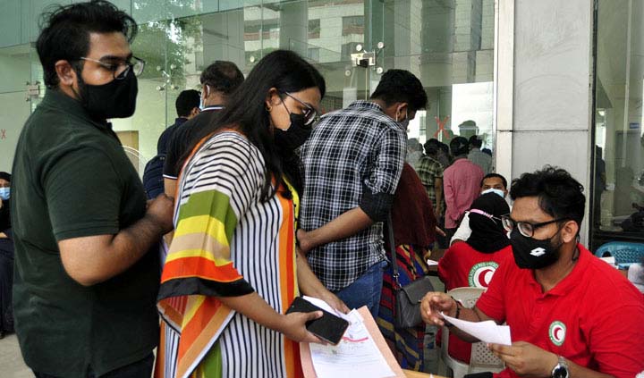 ভ্যাকসিন গ্রহণ করতে রেজিস্টেশন পয়েন্টে সাধারণ মানুষের ভিড় বাড়ছে। ছবিটি মঙ্গলবার বঙবন্ধু শেখ মুজিব মেডিকেল থেকে তোলা।