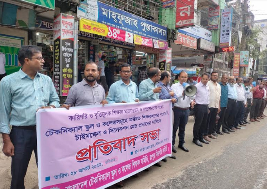 সরকারি টেকনিক্যাল স্কুল ও কলেজের শিক্ষকদেরকে অভিজ্ঞতার ভিত্তিতে পদোন্নতি না দিয়ে নতুন ভাবে নিয়োগ দেওয়ার প্রতিবাদে মানববন্ধন ও প্রতিবাদ সভা করেছে, বাংলাদেশ টেকনিক্যাল স্কুল ও কলেজ শিক্ষক সমিতি, রংপুর বিভাগীয় কমিটি।
