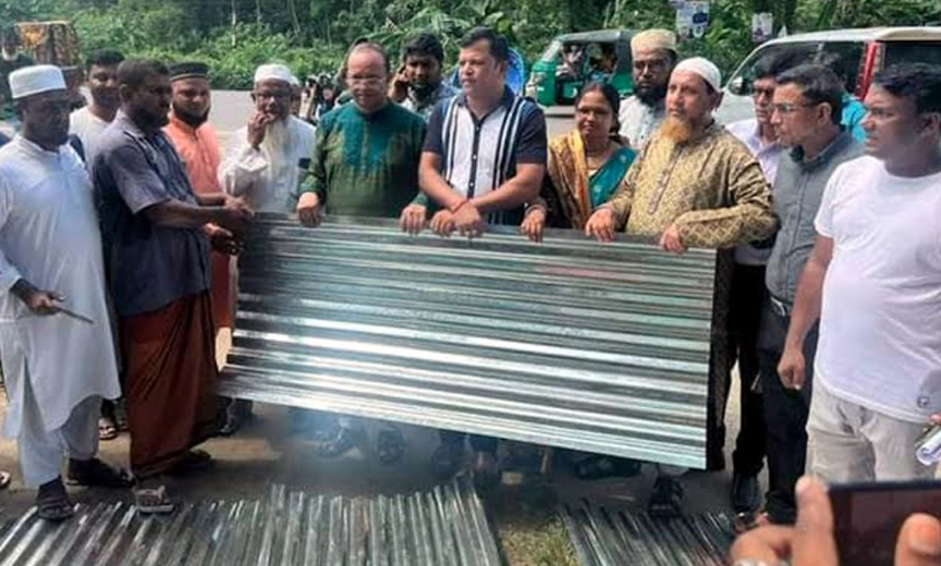 ওসমানীনগরে বন্যার্তদের মধ্যে ঢেউটিন বিতরণ করলেন এমপি মোকাব্বির