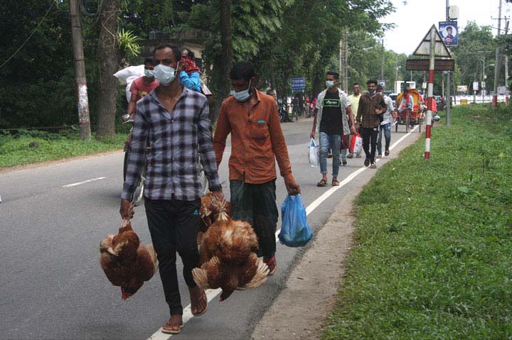 সরকারঘোষিত কঠোর বিধিনিষেধের সপ্তম দিনেও ভোগান্তিকে সঙ্গী করে রাজধানীতে ফিরেছে সাধারণ মানুষ। এ সময় অনেককে রিকশা, ভ্যান, মোটরসাইকেলে আবার কেউ পায়ে হেঁটে নিজেদের গন্তব্যে পৌঁছাতে দেখা গেছে। বৃহস্পতিবার (২৯ জুলাই) দুপুরে সাভার ও আশুলিয়ার বাসস্ট্যান্ড এলাকাগুলোতে লোকজনের ভিড় দেখা যায়। এ সময় দেশের বিভিন্ন স্থান থেকে পরিবার-পরিজন নিয়ে নিজেদের গন্তব্যে যেতে দেখা যায়। লকডাউনের কারণে গণপরিবহন বন্ধ থাকায় বেশিরভাগ মানুষকে রিকশাযোগে চলাচল করতে দেখা গেছে। সিরাজুল ইসলাম নামে এক শিক্ষার্থী বলেন, সিরাজগঞ্জ থেকে হাইসে করে এসেছি। আমাকে গাজিপুরের চন্দ্রা নামিয়ে দিয়েছে। তার পরে রিকশা করে এখানে নবীনগর এসেছি। থাকি সাভার ব্যাংক টাউন এলাকায়। বাবা-মা এখানে থাকেন তাই চলে এসেছি। গ্রামে একা ঈদ করতে গিয়েছিলেন বলে জানান তিনি। ফরিদপুর থেকে আসা আশরাফ নামে এক বেসরকারি চাকরিজীবী বলেন, লকডাউন এত কঠোর হবে বুঝতে পারিনি। আগেও তো লকডাউন দিয়েছে সরকার। তখন তো গাড়ি পাওয়া যেত, এখন তাও নেই। তিনি আক্ষেপ জানিয়ে বলেন, এভাবে চলতে থাকলে কী করবো আমরা বলেন। আমাদের তো গন্তব্যে পৌঁছানোর সুযোগ দেয়া উচিত ছিল। চাকরি বাঁচাতে হবে তাই চলে আসলাম। উল্লেখ্য, ২৩ জুলাই ভোর ৬টা থেকে আগামী ৫ আগস্ট পর্যন্ত কঠোর বিধিনিষেধ আরোপ করেছে সরকার। এই সময়ে জরুরি সেবা দেয়া প্রতিষ্ঠান ছাড়া গণপরিবহন, শিল্প-কারখানা বন্ধ রয়েছে। এর আগে ঈদযাত্রার জন্য বিধিনিষেধে শিথিলতা দেয় সরকার। এই সুযোগে অনেকে গ্রামে ফেরে। পরে বিধিনিষেধের কারণে গণপরিবহন বন্ধ হয়ে যাওয়ায় অনেকে কর্মস্থলে ফিরতে বিপাকে পড়েন।