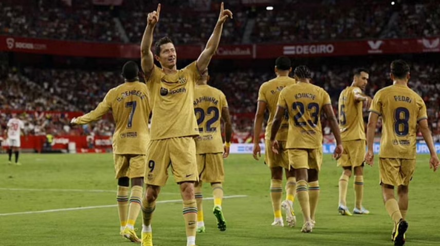 শুরুর দিকে কিছুক্ষণ বার্সেলোনার রক্ষণে ভীতি ছড়াল সেভিয়া। এরপর আর সেভাবে খুঁজেই পাওয়া গেল না দলটিকে। গ্রীষ্মের দলবদলে কাতালান দলটিতে আসা নতুন তিন খেলোয়াড় ছড়ালেন আলো। দাপুটে পারফরম্যান্সে মুখে চওড়া হাসি নিয়ে মাঠ ছাড়ল শাভি এরনান্দেসের দল। প্রতিপক্ষের মাঠে শনিবার রাতে লা লিগার ম্যাচটি ৩-০ গোলে জিতেছে বার্সেলোনা। একটি করে গোল করেন রবের্ত লেভানদোভস্কি, রাফিনিয়া ও এরিক গার্সিয়া। জোড়া অ্যাসিস্ট করেন জুল কুন্দে। স্বাগতিক গোলরক্ষক দুর্দান্ত কিছু সেভ না করলে এবং সফরকারীরা নিশ্চিত কয়েকটি সুযোগ না হারালে ব্যবধান হতে পারত আরও বড়। গোলশূন্য ড্রয়ে আসর শুরু করা বার্সেলোনা পরের তিন ম্যাচে জিতল ৪-১, ৪-০ ও ৩-০ গোলে। চতুর্থ মিনিটে প্রথম উল্লেখযোগ্য সুযোগ পায় সেভিয়া। সাবেক রিয়াল মাদ্রিদ মিডফিল্ডার ইসকোর পাস খুঁজে পায় সাবেক বার্সেলোনা মিডফিল্ডার ইভান রাকিতিচকে। গোলরক্ষককে পরাস্তও করেন তিনি। তবে গোললাইন থেকে ক্লিয়ার করেন ডিফেন্ডার রোনালদ আরাহো। ১৯তম মিনিটে দারুণ সেভে জাল অক্ষত রাখেন বার্সেলোনা গোলরক্ষক মার্ক-আন্ড্রে টের স্টেগেন। ইসকোর পাসে ইউসেফ এন-নেসিরির শট ফিরিয়ে দেন তিনি। দুই মিনিট পরই দারুণ এক পাল্টা আক্রমণে এগিয়ে যায় বার্সেলোনা। উসমান দেম্বেলে বক্সে খুঁজে নেন লেভানদোভস্কিকে। আগুয়ান গোলরক্ষকের ওপর দিয়ে পোলিশ তারকার চিপ গোললাইন থেকে ফেরান মিডফিল্ডার ফের্নান্দো। কাছেই থাকা রাফিনিয়া হেডে বার্সেলোনার হয়ে নিজের প্রথম গোল করেন। সদ্য শেষ হওয়া দলবদলে লিডস ইউনাইটেড থেকে কাতালান দলটিতে নাম লেখানো এই ব্রাজিলিয়ান উইঙ্গার তিন মিনিট পর সুযোগ পান আরেকটি। তবে এবার উড়িয়ে মারেন তিনি। ৩৬তম মিনিটে চমৎকার গোলে ব্যবধান দ্বিগুণ করেন লেভানদোভস্কি। এই মৌসুমে সেভিয়া থেকে কাম্প নউয়ে আসা ফরাসি ডিফেন্ডার কুন্দের ডান দিক থেকে বাড়ানো ক্রস বক্সের ভেতর বুক দিয়ে নামিয়ে ডান পায়ের শটে ঠিকানা খুঁজে নেন তিনি। লা লিগায় অভিষেকে সম্ভাবনা জাগিয়েও জালের দেখা পাননি লেভানদোভস্কি। তবে পরের তিন ম্যাচেই পাঁচ গোল করলেন সাবেক বায়ার্ন মিউনিখ স্ট্রাইকার। গত দুই রাউন্ডে করেছিলেন দুটি করে। বিরতির আগে ব্যবধান বাড়ানোর দুটি সুযোগ নষ্ট হয় সফরকারীদের। পেদ্রির ক্রস ছয় গজ বক্সের মুখে ফাঁকায় পেয়ে হেড লক্ষ্যে রাখতে পারেননি কুন্দে। পাল্টা আক্রমণে বক্সে ঢুকে এগিয়ে আসা গোলরক্ষকের ওপর দিয়ে বাইরে শট করেন দেম্বেলে। অথচ পাশেই ফাঁকায় ছিলেন লেভানদোভস্কি। দ্বিতীয়ার্ধের পঞ্চম মিনিটে স্কোরলাইন হয় ৩-০। ডান দিক থেকে রাফিনিয়ার ক্রস দূরের পোস্টে পেয়ে হেড পাস দেন কুন্দে। বাকিটা সারেন তরুণ স্প্যানিশ ডিফেন্ডার গার্সিয়া। ৬২তম মিনিটে ব্যবধান আ