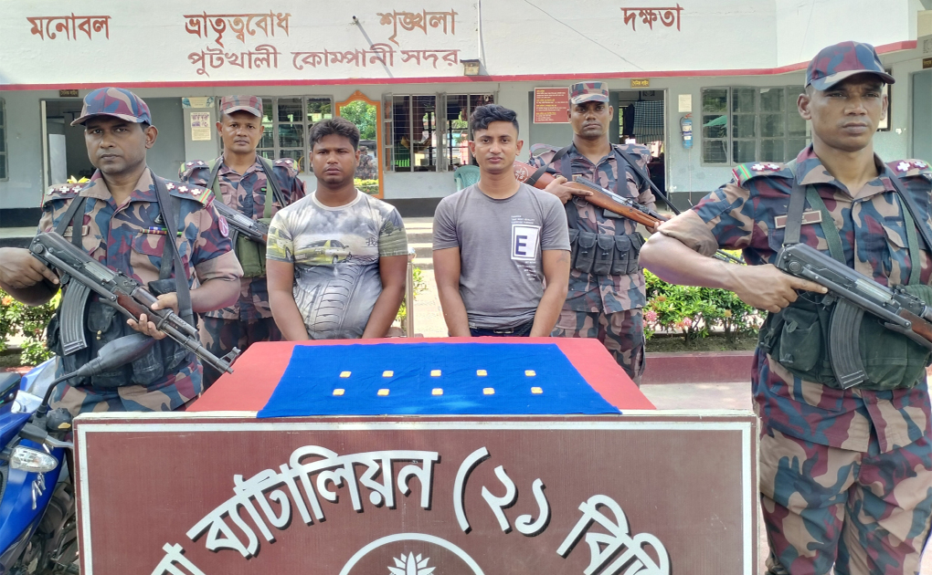 বেনাপোলের পুটখালী সীমান্তে দুইজনকে আটক করা হয়েছে। বুধবার দুপুরে আটকের সময় তাদের কাছ থেকে ১০টি স্বর্ণের বার জব্দ করা হয়েছে বলে দাবি করেছে বর্ডার গার্ড বাংলাদেশের (বিজিবি) সদস্যরা।