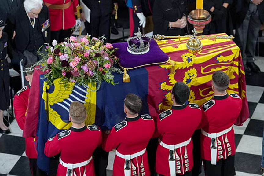 পতাকায় মোড়া রানির কফিনের ওপর ইম্পেরিয়াল স্টেট ক্রাউন রেখে রয়্যাল নেভির নাবিকেরা একটি বন্দুকের গাড়িতে করে চার্চে নিয়ে আসে।