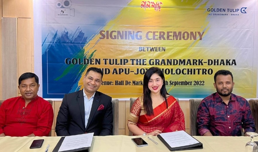 চিত্রনায়িকা অপু বিশ্বাস প্রযোজক হিসেবে আত্মপ্রকাশ করেছেন। তার প্রযোজনায় প্রথম চলচ্চিত্র ‘লাল শাড়ি’র কাজ শুরু হতে যাচ্ছে। এই সিনেমার সঙ্গে যুক্ত হলো হোটেল গোল্ডেন টিউলিপ দ্য গ্রান্ডমার্ক। গত মঙ্গলবার রাজধানীর বনানীতে অবস্থিত গোল্ডেন টিউলিপ রেস্তরাঁয় এ বিষয়ে আনুষ্ঠানিক চুক্তি স্বাক্ষর হয়। এ সময় অপু-জয় চলচ্চিত্রের কর্ণধার অপু বিশ্বাস, পরিচালক বন্ধন বিশ্বাস, গোল্ডেন টিউলিপ দ্য গ্রান্ডর্মাকের ম্যানেজার তারেক, কোরিওগ্রাফার গৌতম সাহাসহ অনেকে উপস্থিত ছিলেন। সম্প্রতি সিনেমার জন্য সরকারি অনুদান পেয়েছেন অপু বিশ্বাস।চলচ্চিত্র নির্মাণের জন্য তথ্য ও সম্প্রচার মন্ত্রণালয় থেকে তাকে ৬৫ লাখ টাকা পেয়েছেন তিনি।গত ২০ জুলাই মন্ত্রণালয়ের সভাকক্ষে অপু বিশ্বাসের হাতে অনুদানের চেক তুলে দেন তথ্য ও সম্প্রচার মন্ত্রণালয়ের সচিব। ‘লাল শাড়ি’ সিনেমাটি নির্মাণ করছেন বন্ধন বিশ্বাস।প্রযোজনার পাশাপাশি এতে অপু অভিনয়ও করবেন। তার বিপরীতে চিত্রনায়ক সাইমন সাদিককে দেখা যাবে।