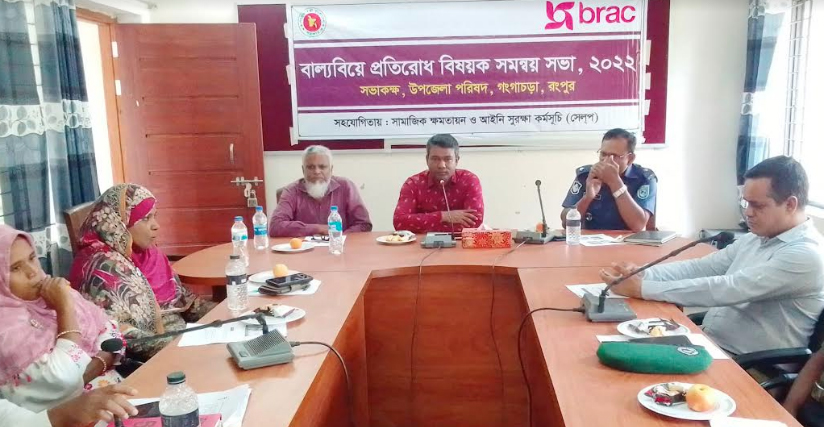 রংপুরের গঙ্গাচড়ায় গতকাল সোমবার (২৬ সেপ্টেম্বর) উপজেলা প্রশাসন কনফারেন্স রুমে বাল্যবিয়ে প্রতিরোধ বিষয়ক সমন্বয় সভা অনুষ্ঠিত হয়। উপজেলা প্রশাসনের আয়োজনে ও সামাজিক ক্ষমতায়ন ও আইনি সুরক্ষা কর্মসূচি (সেলপ) এর সহযোগিতায় অনুষ্ঠিত সভায় সভাপতিত্ব করেন উপজেলা নির্বাহী অফিসার এরশাদ উদ্দিন পিএএ। বক্তব্য রাখেন ওসি (তদন্ত) মমতাজুল হক, সমাজসেবা কর্মকর্তা মোসাদ্দেকুর রহমান, সমবায় কর্মকর্তা আবতাবুজ্জামান চয়ন, প্রধান শিক্ষক এনামুল হক, ইমাম তাজুল ইসলাম, গণমাধ্যম কর্মী সুজন আহম্মেদ প্রমুখ। সেলপ জেলা ব্যবস্থাপক ফজলুল হকের উপস্থাপনায় সভায় সেলপের ডেপুটি ম্যানেজার ইলিয়াছ, অ্যাসোসিয়েট অফিসার রেহেনা পারভীনসহ বিভিন্ন দপ্তরের কর্মকর্তা, ইমাম, কাজী, শিক্ষক, শিক্ষার্থী, গণমাধ্যম কর্মী, যুবপ্রতিনিধি উপস্থিত ছিলেন।