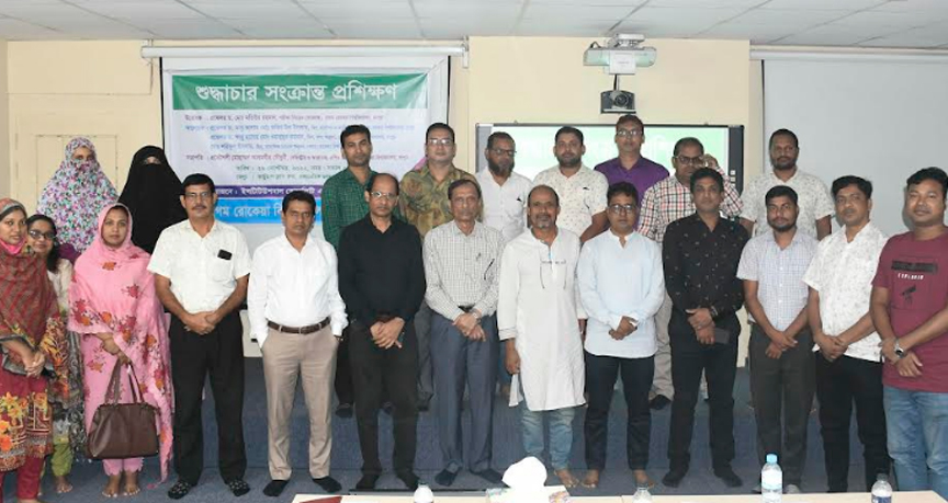 বেগম রোকেয়া বিশ্ববিদ্যালয় (বেরোবি), রংপুরে জাতীয় শুদ্ধাচার সংক্রান্ত প্রশিক্ষণ কর্মশালা অনুষ্ঠিত হয়েছে। বৃহস্পতিবার সকালে একাডেমিক ভবন-২ এর ভার্চুয়াল ক্লাস রুমে ইন্সটিটিউশনাল কোয়ালিটি অ্যাসিউরেন্স সেল আয়োজিত এই প্রশিক্ষণ কর্মশালার উদ্বোধন করেন বিশ্ববিদ্যালয়ের পরীক্ষা নিয়ন্ত্রক (ভারপ্রাপ্ত) প্রফেসর ড. মোঃ মতিউর রহমান। বিশ্ববিদ্যালয়ের রেজিস্ট্রার ও এপিএ টিম আহবায়ক প্রকৌশলী মোহাম্মদ আলমগীর চৌধুরীর সভাপতিত্বে অনুষ্ঠিত প্রশিক্ষণ কর্মশালায় আলোচক হিসেবে অন্যান্যের মধ্যে বক্তব্য রাখেন কলা অনুষদের ডিন প্রফেসর ড. আবু ছালেহ মোহাম্মদ ওয়াদুদুর রহমান, সামাজিক বিজ্ঞান অনুষদের ডিন মোঃ শরিফুল ইসলাম, পরিবহন প্রশাসক ড. মোঃ শফিকুর রহমান, অফিসার্স অ্যাসোসিয়েশনের সভাপতি এ.টি.জি.এম গোলাম ফিরোজ প্রমুখ। এপিএ টিমের ফোকাল পয়েন্ট ও বাজেট শাখার উপ-পরিচালক খন্দকার আশরাফুল আলমের সঞ্চালনায় প্রশিক্ষণ কর্মশালায় বিশ্ববিদ্যালয়ের বিভিন্ন দপ্তর ও বিভাগের কর্মকর্তারা অংশগ্রহণ করেন। অভিযোগ প্রতিকার ব্যবস্থাপনা বিষয়ে অংশীজনের সভা: অপরদিকে বিকালে একই স্থানে অভিযোগ প্রতিকার ব্যবস্থাপনা বিষয়ে অংশীজনের সভা অনুষ্ঠিত হয়। বিশ্ববিদ্যালয়ের অভিযোগ প্রতিকার ব্যবস্থাপনা কমিটির আহবায়ক ও পরীক্ষা নিয়ন্ত্রক (ভারপ্রাপ্ত) প্রফেসর ড. মোঃ মতিউর রহমানের সভাপতিত্বে অনুষ্ঠানে প্রধান অতিথি হিসেবে উপস্থিত ছিলেন উপাচার্য প্রফেসর ড. মোঃ হাসিবুর রশীদ। এতে বক্তৃতা করেন বিশ্ববিদ্যালয়ে কলা অনুষদের ডিন প্রফেসর ড. আবু ছালেহ মোহাম্মদ ওয়াদুদুর রহমান, সামাজিক বিজ্ঞান অনুষদের ডিন মোঃ শরিফুল ইসলাম, পরিবহন প্রশাসক ড. মোঃ শফিকুর রহমান প্রমুখ। অভিযোগ প্রতিকার ব্যবস্থাপনা কমিটির বিকল্প ফোকাল পয়েন্ট জনসংযোগ, তথ্য ও প্রকাশনা বিভাগের উপ-পরিচালক মোহাম্মদ আলীর সঞ্চালনায় উক্ত সভায় স্বগত বক্তৃতা করেন বিশ্ববিদ্যালয়ের ছাত্র উপদেষ্টা ও অভিযোগ প্রতিকার ব্যবস্থাপনা কমিটির ফোকাল পয়েন্ট মোঃ নুরুজ্জামান খান। মতবিনিময় সভায় বিশ্ববিদ্যালয়ের বিভিন্ন বিভাগ ও দপ্তরের কর্মকর্তাবৃন্দ উপস্থিত ছিলেন।##