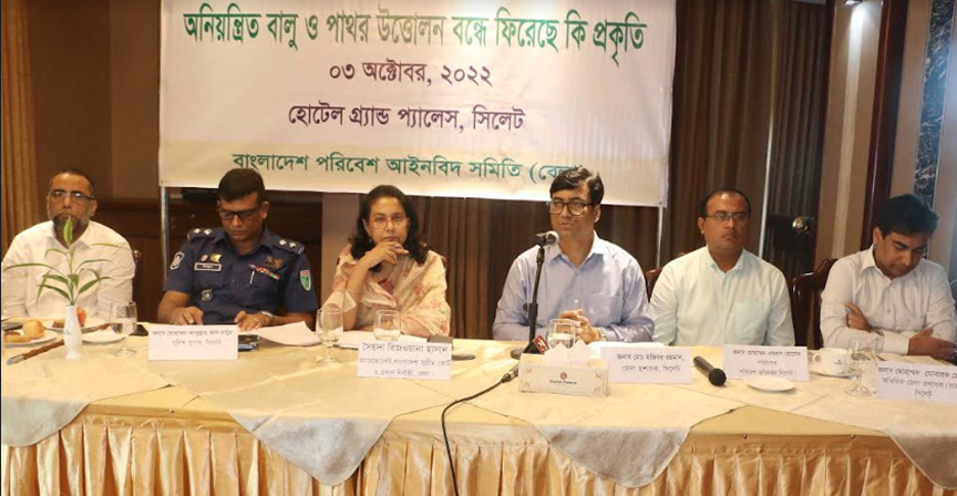 বাংলাদেশ পরিবেশ আইনবিদ সমিতি (বেলা) আয়োজিত ‘অনিয়ন্ত্রিত বালু ও পাথর উত্তোলন বন্ধে ফিরেছে কি প্রকৃতি’ শীর্ষক সংলাপ ৩ অক্টোবর সোমবার সিলেট নগরীর একটি অভিজাত হোটেলের বলরুমে অনুষ্ঠিত হয়।