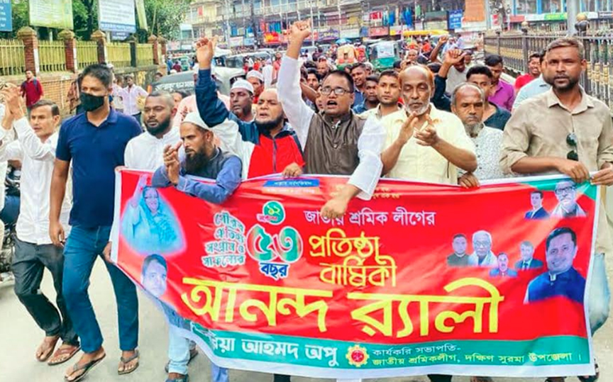 জাতীয় শ্রমিক লীগের ৫৩তম প্রতিষ্ঠা বার্ষিকীতে দক্ষিণ সুরমা উপজেলা আনন্দ র্যালি
