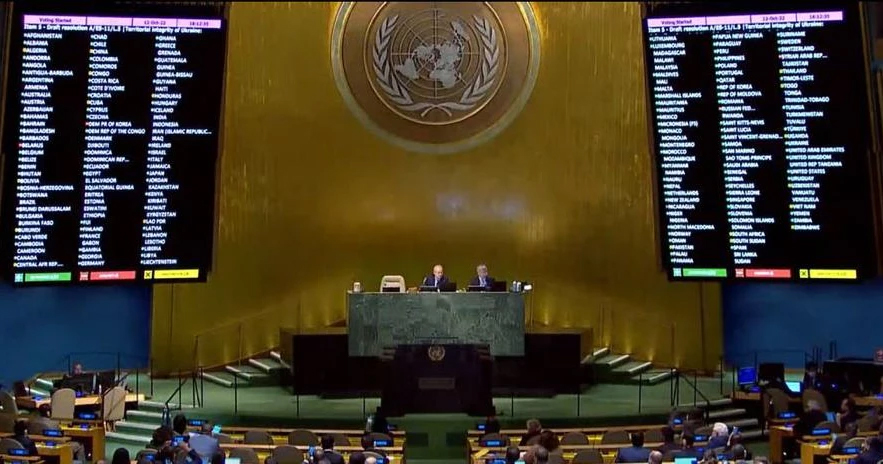 রাশিয়া-ইউক্রেন যুদ্ধ বিষয়ে জাতিসংঘের সাধারণ পরিষদের ১১তম জরুরি বিশেষ অধিবেশনে ‘ইউক্রেনের আঞ্চলিক অখণ্ডতা: জাতিসংঘ সনদের মূলনীতি রক্ষা’ শীর্ষক জাতিসংঘের প্রস্তাবের পক্ষে ভোট দিয়েছে বাংলাদেশ।