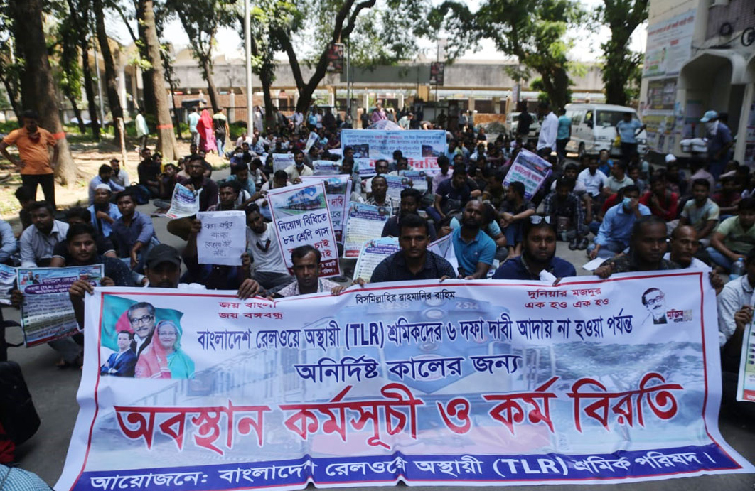 রাজধানীর কমলাপুর রেলওয়ে প্রশাসনিক ভবনের সামনে বিক্ষোভ করছেন অস্থায়ী কর্মচারীরা। চাকরি স্থায়ীকরণের দাবিতে রোববার (১৬ অক্টোবর) বেলা ১১টার দিকে তারা বিক্ষোভ শুরু করেন। ঢাকা রেলওয়ে থানার (কমলাপুর) ভারপ্রাপ্ত কর্মকর্তা (ওসি) ফেরদৌস আহমেদ বিশ্বাস এই তথ্য নিশ্চিত করেছেন। তিনি বলেন, বিক্ষোভ এখনো চলছে। আমরা পরিস্থিতি সামাল দেয়ার চেষ্টা করছি। অপরদিকে নাটোর স্টেশনেও একই দাবিতে ধর্মঘট পালন করছেন রেলওয়েতে মাস্টাররোলে কর্মরতরা। এ কারণে সিগন্যাল না পেয়ে নাটোর স্টেশনের আউটারে আটকা পড়ে আন্তঃনগর তিতুমীর এক্সপ্রেস ট্রেন। নাটোরে ট্রেন আটকে থাকায় যাতায়াতকারী ও চাকরিজীবীরা পড়েন বেকায়দায়। নাটোর স্টেশনের পয়েন্টসম্যান আমিনুল ইসলাম জানান, রেলওয়েতে মাস্টাররোলে কর্মরত প্রায় পাঁচ শ’ পয়েন্টসম্যান ও প্রায় তিন শ’ পোটার তাদের চাকরি স্থায়ীকরণের দাবিতে ঢাকায় অবস্থান করছেন। এ কারণে সিগন্যাল সমস্যায় আটকা পড়ে ট্রেন। জানা গেছে, বেতন-ভাতা ও চাকরি স্থায়ীকরণের দাবিতে নাটোরে রেলের তৃতীয় শ্রেণির কর্মচারীদের ধর্মঘটে উত্তরবঙ্গের সাথে সারা দেশের প্রায় দুই ঘণ্টা ট্রেন চলাচল বন্ধ ছিল। তবে বর্তমানে ট্রেন চলাচল স্বাভাবিক রয়েছে। সকালে দুই ঘণ্টা ট্রেন চলাচল বন্ধ থাকার পর তিতুমীর এক্সপ্রেস ট্রেনটি ৯টা ৩৫ মিনিটে নাটোর রেলস্টেশনের ২ নম্বর প্ল্যাটফর্ম থেকে চিলাহাটির উদ্দেশে ছেড়ে গেছে। নাটোর রেলওয়ে স্টেশনের মাস্টার মোছা. কামরুন্নাহার সাংবাদিকদের বলেন, রাজশাহী থেকে ছেড়ে আসা চিলাহাটিগামী আন্তঃনগর তিতুমীর এক্সপ্রেস ট্রেনটি আব্দুলপুর স্টেশন থেকে ৭টা ৩৫ মিনিটে ছেড়ে আসে। কিন্তু রেলওয়ের কর্মচারীরা বেতন-ভাতা ও চাকরি স্থায়ীকরণের দাবিতে ভোর ৬টা থেকে ধর্মঘট ডাকেন। এ কারণে ডাউন না দেয়ায় আমরা ট্রেন রিসিভ করতে পারিনি। ৭টা ৪৫ মিনিটের তিতুমীর এক্সপ্রেস ট্রেনটি সকাল ৯টা ৩০ মিনিটে নাটোর রেলস্টেশনে এসে পৌঁছায়। তবে বর্তমানে ট্রেন চলাচল স্বাভাবিক রয়েছে। তিনি আরো জানান, যাত্রীদের ভোগান্তির কথা চিন্তা করে ঊর্ধ্বতন কর্তৃপক্ষের নির্দেশে কাগজে লিখিত অনুমতি দিয়ে ট্রেন চলাচল শুরু হয়েছে। এভাবে প্রতিটি ট্রেনই লিখিত অনুমতি নিয়ে চলাচল করছে। তিনি জানান, নাটোর স্টেশনে তিনটি লাইন থাকলেও এখন একটি লাইন স্বাভাবিক রয়েছে।