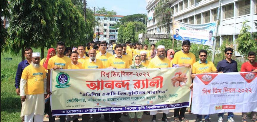 নানা আয়োজনের মধ্য দিয়ে সিলেট কৃষি বিশ্ববিদ্যালয়ে (সিকৃবি) পালিত হলো বিশ্ব ডিম দিবস ২০২২। ১৭ অক্টোবর সোমবার সিলেট কৃষি বিশ্ববিদ্যালয়ে এক বর্ণাঢ্য র্যালি অনুষ্ঠিত হয়। ভেটেরিনারি, এনিম্যাল ও বায়োমেডিক্যাল সায়েন্সেস অনুষদ ভবনের সামনে থেকে শুরু হওয়া র্যালিটি সমগ্র ক্যাম্পাস প্রদক্ষিণ করে বলে জানিয়েছে সিকৃবির জনসংযোগ ও প্রকাশনা দপ্তর। র্যালিতে বিশ্ববিদ্যালয়ের বিভিন্ন বিভাগের শিক্ষক, কর্মকর্তা, কর্মচারী ও শিক্ষার্থীবৃন্দ অংশ নেয়। র্যালি শেষে ভেটেরিনারি, এনিম্যাল ও বায়োমেডিক্যাল সায়েন্সেস অনুষদের সম্মেলন কক্ষে দিবসটির প্রতিপাদ্য “প্রতিদিন একটি ডিম, পুষ্টিময় সারাদিন” নিয়ে একটি আলোচনা সভা অনুষ্ঠিত হয়। ভেটেরিনারি এনিম্যাল ও বায়োমেডিক্যাল সায়েন্সেস অনুষদের ডিন প্রফেসর ড. এম রাশেদ হাসনাতের সভাপতিত্বে আলোচনা অনুষ্ঠানে প্রধান অতিথি হিসেবে বক্তব্য রাখেন ভারপ্রাপ্ত ভাইস-চ্যান্সেলর প্রফেসর ড. মোহাম্মদ মেহেদী হাসান খান। বিশেষ অতিথি হিসেবে বক্তব্য রাখেন প্রাণিসম্পদ অধিদপ্তরের পরিচালক ড. মোঃ জাকির হোসেন। অনুষ্ঠানে স্বাগত বক্তব্য রাখেন ডিম দিবস উদযাপন কমিটির আহ্বায়ক প্রফেসর ড. এ. এস. এম মাহবুব, শুভেচ্ছা বক্তব্য রাখেন অয়েস্ট্রার পোল্ট্রি ও ফিশারিজ লিমিটেড সিলেটের ব্যবস্থাপনা পরিচালক মোঃ ইমরান হোসেন, জেলা প্রাণী সম্পদ কর্মকর্তা ডাঃ রুস্তম আলী। অনুষ্ঠানটি সঞ্চলানা করেছেন এনাটমি ও হিস্টোলজি বিভাগের লেকচারা ডাঃ আঁখী পাল। আলোচনা সভায় মূল প্রবন্ধ উপস্থাপন করেন বাংলাদেশ প্রাণিসম্পদ গবেষণা ইনস্টিটিউটের পোল্ট্রি গবেষণা সেন্টারে মূখ্য বৈজ্ঞানিক কর্মকর্তা ড. মোঃ আব্দুর রশীদ। এর আগে বালুচর সরকারী প্রাথমিক বিদ্যালয় এবং আলুরতল বাগমারা মহল্লায় রফিক শফিক সরকারি প্রাথমিক বিদ্যালয়ের শিশুদের ডিম খাওয়ানোর মধ্য দিয়ে দিবসের কার্যক্রম শুরু হয়। এসব স্কুল ফিডিং কর্মসূচির আয়োজন করেছে সিলেটের কাজী ফার্মস লিমিটেড।