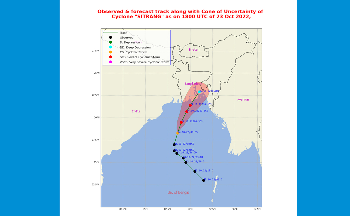 পূর্ব-মধ্য বঙ্গোপসাগর ও তৎসংলগ্ন পশ্চিম মধ্যবঙ্গোপসাগর এলাকায় অবস্থানরত ‘সিত্রাং’ উত্তর-উত্তরপূর্বদিকে অগ্রসর হয়ে পূর্ব-মধ্যবঙ্গোপসাগর ও তৎসংলগ্ন পশ্চিম মধ্যবঙ্গোপসাগর এবং উত্তর বঙ্গোপসাগর এলাকায় অবস্থান করছে।