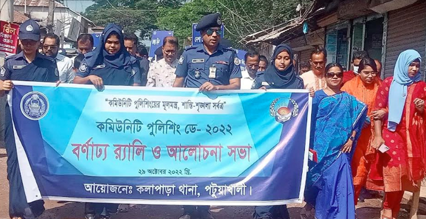 “কমিউনিটি পুলিশিংয়ের মূলমন্ত্র,শান্তি শৃঙ্খলা সর্বত্র”এই প্রতিপাদ্য বিষয়কে ধারণ করে পটুয়াখালীর কলাপাড়ায় পালিত হয়েছে কমিউনিটি পুলিশিং ডে। এ উপলক্ষে শনিবার সকাল ১০ টায় কলাপাড়া থানার উদ্যোগে পৌর শহরে একটি বর্ণাঢ্য র‌্যালী বের করা হয়। এতে পুলিশ, শিক্ষক, রাজনৈতিক নেতৃবৃন্দ, জনপ্রতিনিধিরা অশংগ্রন করেন। র‌্যালীটি পৌর শহরের বিভিন্ন সড়ক প্রদক্ষিন শেষে থানা চত্বরে এক আলোচনা সভায় মিলিত হয়। কলাপাড়া থানার ওসি মো.জসিম’র সভাপতিত্বে প্রধান অতিথি হিসেবে বক্তব্য রাখেন অতিরিক্ত পুলিশ সুপার কলাপাড়া সার্কেল মো.আবুল কালাম আজাদ। বিশেষ অতিথি হিসেবে বক্তব্য রাখেন উপজেলা পরিষদ চেয়ারম্যান বীর মুক্তিযোদ্ধা এস এম রাকিবুল আহসান, উপজেলা আওয়ামী লীগের সাধারণ সম্পাদক বীর মুক্তিযোদ্ধা আব্দুল মোতালেব তালুকদার, পৌর মেয়র বিপুল চন্দ্র হাওলাদার, উপজেলা আওয়ামী লীগের সহ-সভাপতি ড.শহিদুল ইসলাম বিশ্বাস, কলাপাড়া প্রেসক্লাবের সভাপতি মো.হুমায়ুন কবির, উপজেলা মহিলা ভাইস চেয়ারম্যান শাহিনা পারভীন সিমা, বালিয়াতলী ইউপি চেয়ারম্যান মো.হুমায়ুন কবির প্রমুখ। সভা শেষে কমিউনিটি পুলিশিং ডে-২০২২ উপলক্ষে কাটা হয়েছে কেক। অনুষ্ঠান সঞ্চলনা করেন কলাপাড়া থানার ওসি (তদন্ত)মো.মোস্তাফিজ। এছাড়া মৎস্য বন্দর মহিপুর ও পর্যটন নগরী কুয়াকাটায় কমিউনিটি টুলিশিং ডে উপলক্ষে র‌্যালী ও আলোচনা সভা অনুষ্ঠিত হয়েছে।