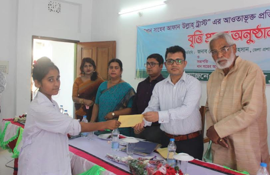 রংপুর জেলা প্রশাসনের আয়োজনে গত মঙ্গলবার খান সাহেব আফান উল্লাহ ট্রাস্ট এর আওতাভূক্ত মাহিগঞ্জ বালিকা উচ্চ বিদ্যালয় ও কলেজের ৮১ জন শিক্ষার্থীর মাঝে ট্রাস্ট কর্তৃক আদায়কৃত অর্থ থেকে মোট ৬০,৭৫০/- টাকা শিক্ষাবৃত্তি বিতরণ করা হয়। এতে অনুষ্ঠানের প্রধান অতিথি রংপুরের জেলা প্রশাসক ও খান সাহেব আফান উল্লাহ ট্রাস্ট এঁর সভাপতি মোঃ আসিব আহসানে পক্ষে বৃত্তি প্রদান করেন অতিরিক্ত জেলা প্রশাসক (রাজস্ব) এ. ডব্লিউ.এম রায়হান শাহ। এসময় কলেজের সভাপতি রামকৃষ্ণ সোমানী, অধ্যক্ষ জাহানারা খানম, আওয়ামী লীগ নেতা নুর এ-এলাহি সোহেল সহ ট্রাস্টের পরিচালনা কমিটির সদস্যবৃন্দ ও উক্ত প্রতিষ্ঠানের পরিচালনা কমিটির সদস্য এবং শিক্ষক-শিক্ষার্থীরা উপস্থিত ছিলেন।