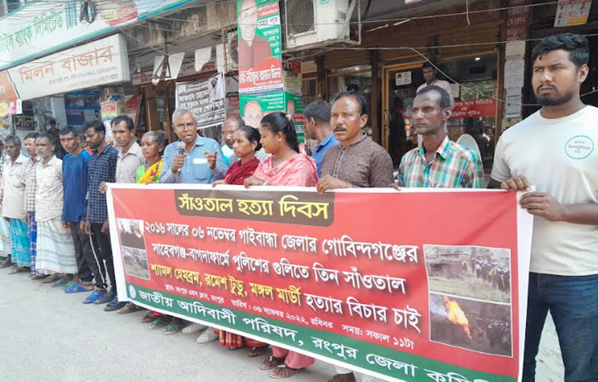 সাঁওতাল হত্যার বিচারের দাবিতে রংপুরে আদিবাসীদের মানববন্ধন কর্মসূচি