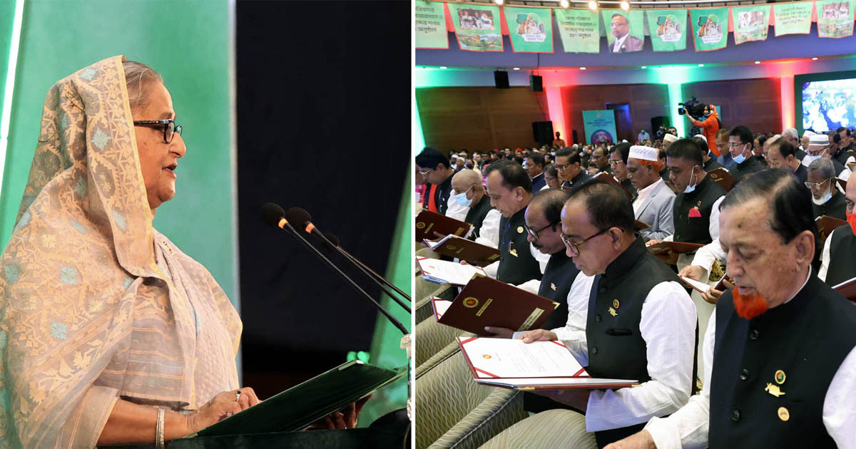 সোমবার রাজধানীর বঙ্গবন্ধু আন্তর্জাতিক সম্মেলন কেন্দ্রে (বিআইসিসি) এক অনুষ্ঠানে জেলা পরিষদের নবনির্বাচিত চেয়ারম্যানদের শপথবাক্য পাঠ করান প্রধানমন্ত্রী শেখ হাসিনা।