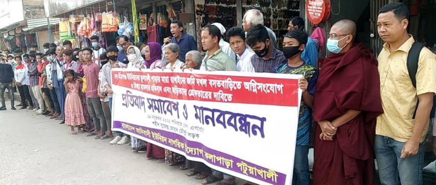 পটুয়াখালীর কলাপাড়ায় এক রাখাইন পরিবারের জমি দখল, বসতবাড়ী আগুনে পুড়িয়ে দেয়া সহ নির্যাতন, নিপীড়নের ও মিথ্যা মামলা দিয়ে হয়রানির বিরুদ্ধে এক মানববন্ধন ও সমাবেশ অনুষ্ঠিত হয়েছে। শনিবার বেলা ১১টায় পৌর শহরের সুরেন্দ্র মোহন চৌধুরী সড়কে বাংলাদেশ আদিবাসি ইউনিয়ন নাগরিক উদ্যোগ কলাপাড়া এর আয়োজনে করে। প্রায় ঘন্টা ব্যাপী এ কর্মসূচিতে উপজেলার বালিয়াতলী ইউনিয়নের তুলাতলী গ্রামের ভূক্তভোগী রাখাইন পরিবারের সদস্যরা ও বিভিন্ন পাড়ার রাখাইন নেতৃবৃন্দসহ শ্রেনী পেশার লোকজন উপস্থিত ছিলেন।