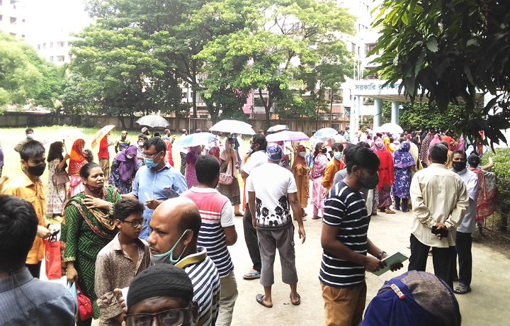 করোনা সংক্রমণ রোধে ৭ আগস্ট থেকে গণটিকা দেওয়া শুরু করেছে সরকার। কিন্তু টিকাদান কেন্দ্রগুলোতে মানা হচ্ছে না স্বাস্থ্যবিধি। এতে সংক্রমণ ঝুঁকি আরও বাড়তে পারে বলে আশঙ্কা করা হচ্ছে। সোমবার (৯ আগষ্ট) রাজধানীর গণটিকাদান কেন্দ্রে দেখা যায়, মানুষের উপচেপড়া ভিড়। নূন্যতম সামাজিক দূরত্ব রক্ষিত হয়নি। অন্যদিকে করোনাভাইরাসের সংক্রমণ রোধে ইউনিয়ন-ওয়ার্ড পর্যায়ে চলা গণ টিকাদান কর্মসূচিতে ‘ধারণার চেয়ে বেশি’ মানুষের চাপ সামলাতে হচ্ছে বলে জানাচ্ছেন স্বাস্থ্য কর্মকর্তারা। সোমবার (৯ আগষ্ট) কর্মসূচির তৃতীয় দিনেও মানুষের চাপ বাড়ায় সবাইকে টিকা দেওয়া যায়নি। টিকাকেন্দ্রে আসা মানুষের তুলনায় বরাদ্দ পাওয়া টিকার পরিমাণ কম থাকায় আগ্রহী অনেককে ফিরিয়ে দিচ্ছেন তারা। ছয় দিনের এই কর্মসূচির প্রথম দুই দিনে ৩৫ লাখের বেশি মানুষ করোনাভাইরাসের টিকার প্রথম ডোজ পেয়েছেন। স্বাস্থ্য কর্মকর্তারা বলছেন, বরাদ্দ পাওয়া টিকা কমে আসায় কোনো কোনো এলাকায় দৈনিক ডোজের পরিমাণও কমিয়ে আনতে হচ্ছে। গত দুই দিনের মত সোমবারও (৯ আগষ্ট) ঢাকা মহানগরীর টিকাকেন্দ্রগুলোতে উপচে পড়া ভিড় ছিল। কোনো কোনো কেন্দ্রে ভোর থেকেই লাইনে দাঁড়ান আগ্রহীরা। তবে ঢাকার দুই সিটি করপোরেশনের টিকাকেন্দ্রগুলোতে দৈনিক ৩৫০ ডোজ টিকার বরাদ্দ থাকায় টিকা পাননি অনেকেই। এত মানুষ টিকা নিতে আসবেন, সেটি যে ধারণার বাইরে ছিল; তা জানান ঢাকা জেলার সিভিল সার্জন ডা. আবু হোসেন মো. মইনুল আহসান। তিনি বলেন, মানুষের আগ্রহ অনেক বেশি। আমাদের ধারণার চেয়ে অনেক বেশি মানুষের চাপ। সে তুলনায় টিকার সাপ্লাই দেওয়া যাচ্ছে না।