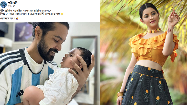 গোটা বিশ্ব মেতে উঠেছে ফুটবল বিশ্বকাপের উন্মাদনায়। এ তালিকায় পিছিয়ে নেই বাংলাদেশের সাধারণ মানুষ থেকে তারকারাও। গ্রুপপর্বের প্রথম ম্যাচে সৌদি আরবের বিপক্ষে ১-২ গোলের ব্যবধানে পরাজিত হয়েছে আর্জেন্টিনা। এ পরাজয়ে আর্জেন্টিনার ভক্তরা মুখ থুবড়ে পড়েন হতাশায়। এ তালিকায় আছেন ঢালিউডের আলোচিত অভিনেত্রী পরীমণিও। গত মঙ্গলবার সৌদি আরবের বিপক্ষে ম্যাচ হেরে যায় আর্জেন্টিনা। এ হারে কোটি ভক্তের মতো পরীমণিও কষ্ট পেয়েছেন। আর তার কষ্ট কিছুটা লাঘব করতে এগিয়ে এসেছেন তার স্বামী শরিফুল রাজ। বুধবার (২৩ নভেম্বর) রাতে পরী তার ফেসবুকে একটি ছবি প্রকাশ করেন। সেই ছবিতে দেখা যায়, রাজ তাদের সন্তানকে কোলে নিয়ে আছেন, আর রাজের গায়ে আর্জেন্টিনার জার্সি। ছবিটির সঙ্গে পরী ক্যাপশনে লিখেছেন: ‘উনি (রাজ) ব্রাজিলের সাপোর্টার মানে ঘোর ব্রাজিল যাকে বলে। কিন্তু সে আজ আমার দুঃখ কমাতে আর্জেন্টিনা পরে ফেলছে! কেমনডা লাগে!’ মাঝে পরীর স্ট্যাটাস দেখে অনেকেই ভেবেছিলেন হয়তো তাদের সংসারের ভবিষ্যৎ ভালোর দিকে নেই। তবে তাদের একজনের প্রতি অপরজনের কেয়ারিং দেখে বোঝা যাচ্ছে, বেশ ভালোই আছেন তারা।