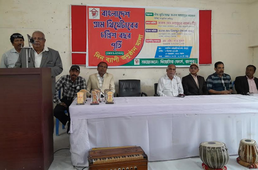 বাংলাদেশ গ্রাম থিয়েটারের ৪০ বছর পূর্তিতে দিন ব্যাপী অনুষ্ঠান করেছে থিয়েটার ফোর্স, রংপুর। শুক্রবার সকাল হতে দিনব্যাপী পাবলিক লাইব্রেরি হলরুমে বাংলাদেশ গ্রাম থিয়েটারের ৪০ বছর পূর্তি অনুষ্ঠান অনুষ্ঠিত হয়েছে। থিয়েটার ফোর্সের কর্মসূচির মধ্যে ছিলো জাতীয় সংগীতের তালে পতাকা উড়িয়ে অনুষ্ঠানের উদ্বোধন, শিশুদের চিত্রাঙ্কন প্রতিযোগিতা, শিশুদের নাট্য কর্মশালা, আলোচনা সভা ও পুরস্কার বিতরণ, যুদ্ধ সে আর নয় নাটকের প্রদর্শনী এবং মনোজ্ঞ সাংস্কৃতিক অনুষ্ঠান। অনুষ্ঠানে উদ্বোধন করেন বীর মুক্তিযোদ্ধা ও বিশিষ্ট সাংস্কৃতিক ব্যাক্তিত্ব মাহবুবুর রহমান, অনুষ্ঠানের প্রধান অতিথি বীর মুক্তিযোদ্ধা ও রংপুর সাহিত্য পরিষদের সাধারণ সম্পাদক আকবর আলী, বিশেষ অতিথি গ্রাম থিয়েটার বেগম রোকেয়া সমন্বয়কারী রংপুর অঞ্চল নিজামুল ইসলাম বাবলু, থিয়েটার ফোর্স এর সভাপতি নবীউল্ল্যা পান্না, কারমাইকেল কলেজের সাবেক ভিপু আলাউদ্দিন। অনুষ্ঠানে উৎসব উদযাপন কমিটির সমন্বয়কারী এম এইচ খান সুজাদ এর সভাপতিত্বে উপস্থিত থেকে বক্তব্য রাখেন সাবেক কালচারাল অফিসার ও সাংস্কৃতিক ব্যাক্তিত্ব এএসএম আব্দুল রহিম, উৎসব উদযাপন কমিটির সাংস্কৃতিক বিষয়ক আহবায়ক একারামুল হোসেন শাহাদাত, সদস্য সচিব আতিকুর রহমান তোকদারসহ উদযাপন কমিটির সদস্যবৃন্দ।