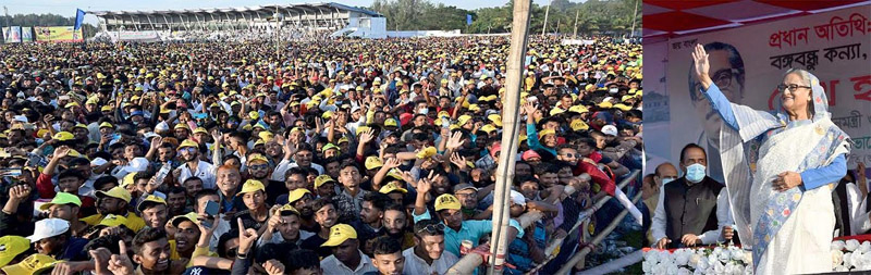 ‘আপনারা কি নৌকা মার্কায় ভোট দেবেন’, প্রধানমন্ত্রী জানতে চাইলে জনগণ চিৎকার করে দুই হাত তুলে তাতে সম্মতি দেয়।