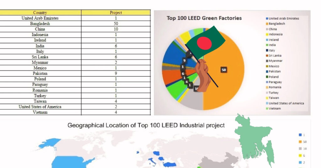 ইউএসজিবিসি অনুসারে, বাংলাদেশের ১৮৭টি গ্রিন-সার্টিফাইড কারখানার মধ্যে ৬৩টি প্লাটিনাম-রেটেড, ১১০টি গোল্ড-রেটেড, ১০টি সিলভার-রেটেড ও চারটি গ্রিন-সার্টিফাইড।