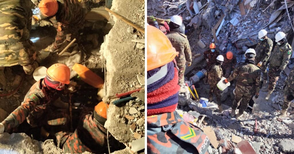সেনাবাহিনীর নেতৃত্বে তাদের ও ফায়ার সার্ভিসের উদ্ধারকর্মীরা এ পর্যন্ত জীবিত একজন ও মৃত ১৯ জনকে উদ্ধার করেছে।
