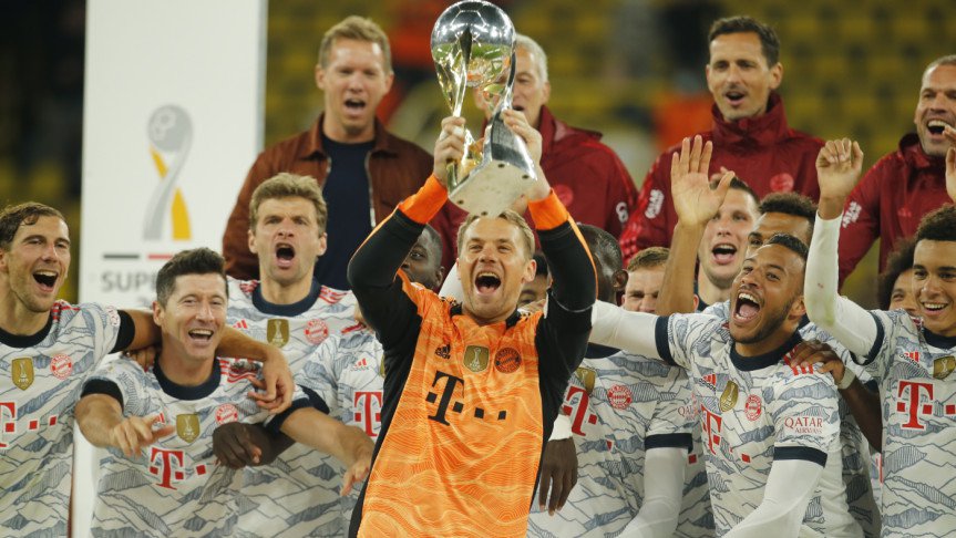 মৌসুমের শুরুতেই বায়ার্ন মিউনিখকে শিরোপা এনে দিলেন রবার্তো লেভানদোভস্কি। গুরুত্বপূর্ণ ম্যাচে জোড়া গোল করলেন তিনি। সঙ্গে জালের দেখা পেয়েছেন টমাস মুলার। দুই তারকার গোলে বরুশিয়া ডর্টমুন্ডকে হারিয়ে জার্মান সুপার কাপের শিরোপা জিতল বায়ার্ন মিউনিখ। মঙ্গলবার রাতে সিগনাল ইদুনা পার্কে ডর্টমুন্ডকে ৩-১ গোলে হারিয়েছে বায়ার্ন। ডর্টমুন্ডের একমাত্র গোলটি করেছেন মার্কো রয়েস। জার্মান সুপার কাপের ইতিহাসে এই নিয়ে টানা দ্বিতীয় এবং রেকর্ড নবম শিরোপা ঘরে তুলল বায়ার্ন। এদিন ম্যাচের বেশির ভাগ সময় বল দখলে রাখা বায়ার্ন গোলের দেখা পায় ৪১ মিনিটে। বাঁ-দিকে একজনকে কাটিয়ে জিনাব্রির বাড়ানো ক্রসে ছুটে গিয়ে দারুণ হেডে দলকে এগিয়ে নেন লেভানদোভস্কি। এরপর বিরতি থেকে ফিরেই আরেকবার ডর্টমুন্ডের জালে বল পাঠায় বায়ার্ন। ৪৯ মিনিটে সতীর্থের পাস ভালো পজিশনে পেলেও গোলরক্ষককে এগিয়ে আসতে দেখে ছেড়ে দেন লেভানদোভস্কি। পেছনে ছিলেন টমাস মুলার। গোলমুখে ফাঁকায় বল পেয়ে ভুল করেননি তিনি। অনায়াসে জালে পাঠিয়ে ব্যবধান দ্বিগুণ করেন মুলার। এরপর ৬৪ মিনিটে ব্যবধান কমায় ডর্টমুন্ড। বায়ার্নের ডি-বক্সের বাইরে থেকে রয়েসের দারুণ বাঁকানো শট পোস্ট ঘেঁষে জালে চলে যায়। গোল পেয়ে কিছুটা আশা জাগিয়েও শেষ পর্যন্ত পারেনি ডর্টমুন্ড। ৭৪ মিনিটে লেভা আরেকবার গোল করলে ম্যাচে ফেরার আশা ভেস্তে যায় ডর্টমুন্ডের। সতীর্থের পায়ে লেগে পাওয়া বল ধরে এগিয়ে গিয়ে সহজেই ৩-১ ব্যবধানের জয় নিশ্চিত করেন লেভানদোভস্কি। এই নিয়ে সুপার কাপে রেকর্ড সাতটি গোল করলেন পোলিশ তারকা। তাঁর পরেই আছেন টমাস মুলার।