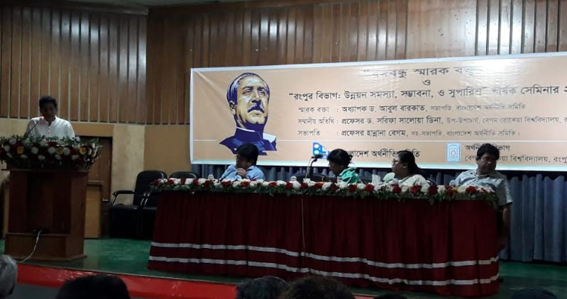 শনিবার নগরীর আরডিআরএস মিলনায়তনে বাংলাদেশ অর্থনীতি সমিতি ও বেগম রোকেয়া বিশ্ববিদ্যালয়, রংপুরের অর্থনীতি বিভাগের যৌথ আয়োজনে অনুষ্ঠিত ‘বঙ্গবন্ধু স্মারক বক্তৃতা ও রংপুর বিভাগ উন্নয়ন সমস্যা, সম্ভাবনা ও সুপারিশ’ শীর্ষক সেমিনারে বক্তারা এসব কথা বলেন।